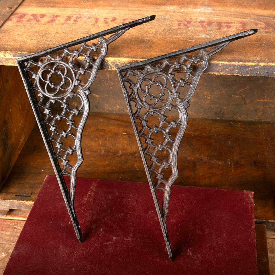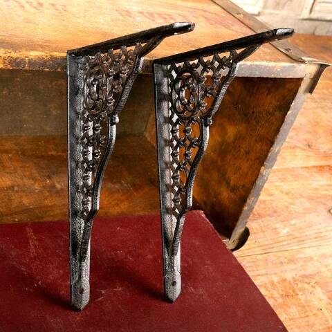 Pair of architectural salvage antique cast iron shelf brackets each measuring approx. 3/4" wide x 6 3/4" tall x 5" front to back. See photos to evaluate condition. Priced at $75 for the pair.