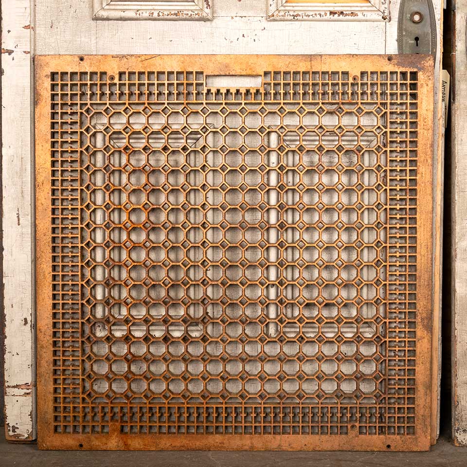 Architectural salvage large antique cast iron cold air return floor grate vent cover measuring approx. 29 3/4" x 29 3/4" (insert dimensions) and 32" x 32" (overall dimensions). See photos to evaluate condition.