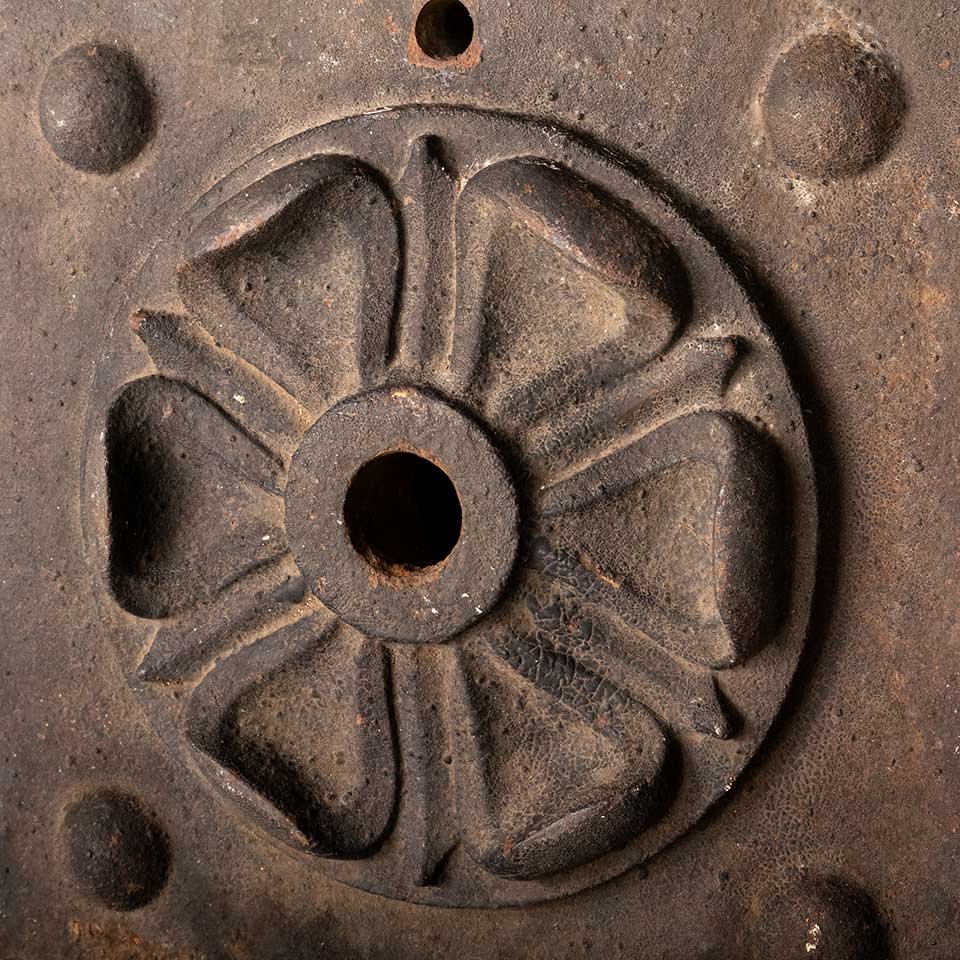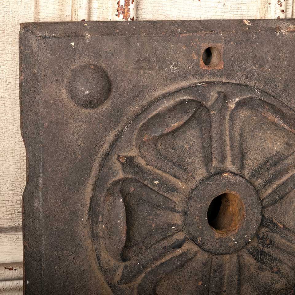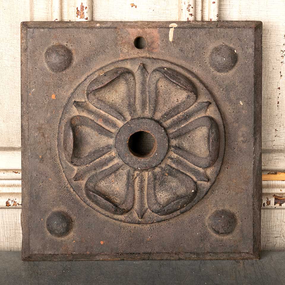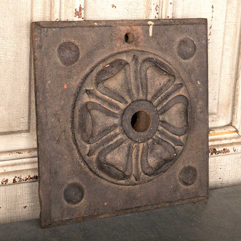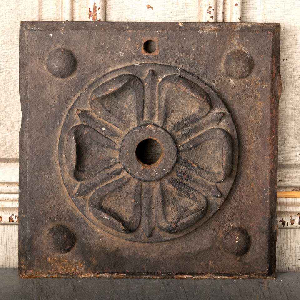 Architectural salvage antique cast iron building wall stabilizer plate with floral rosette in relief measuring approx. 11 7/8" x 11 7/8" x 1 3/4" front to back. Color and condition may vary. Priced at $275/each.