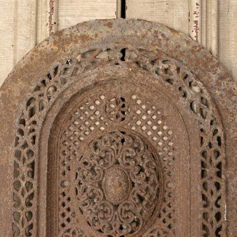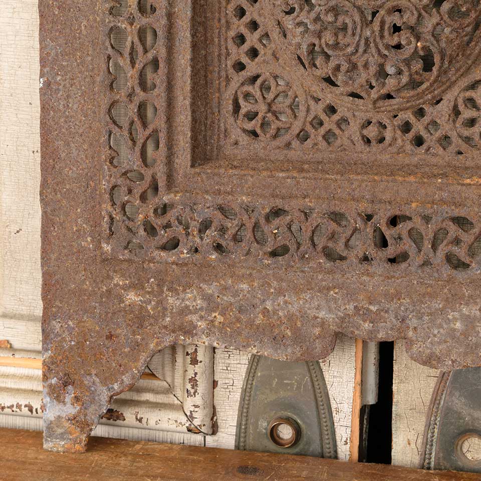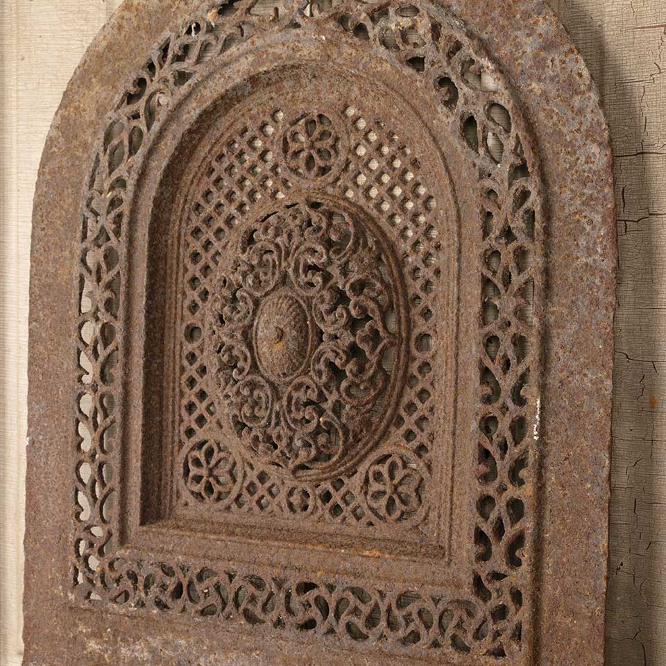 Architectural salvage antique ornate arched top cast iron fireplace summer front cover measuring approx. 18 3/4" wide x 26 3/8" tall x 2" front to back. There's surface rust and pitting in the metal. See photos to evaluate condition.