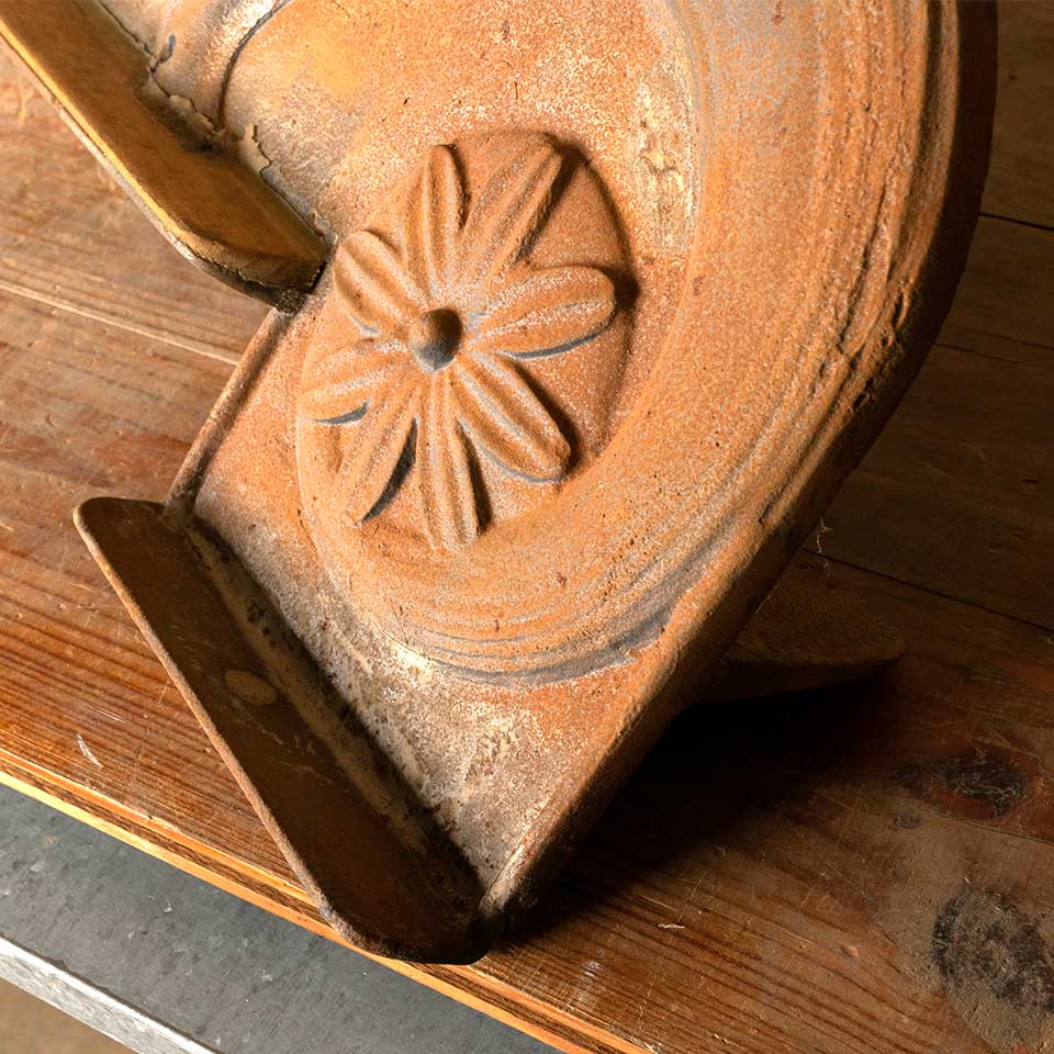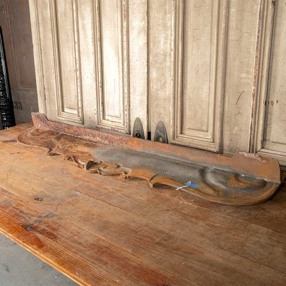 Architectural salvage antique cast iron pediment measuring approx. 51 1/4" wide x 11 1/4" tall x 5" front to back. See photos to evaluate condition.