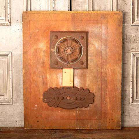 Architectural salvage antique cast iron building wall anchor plates foundry mold mounted to plywood measuring approx. 31 1/2" wide x 38" tall x 3" front to back. See photos to evaluate condition.