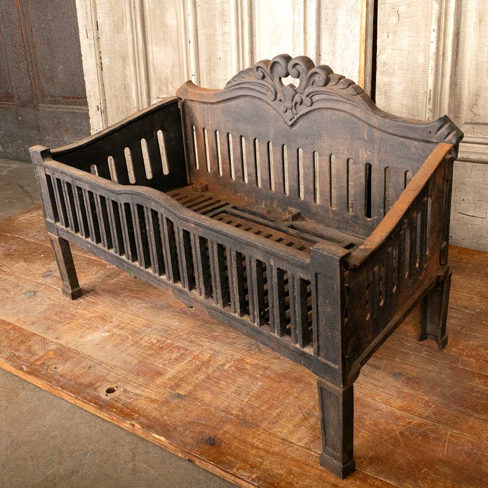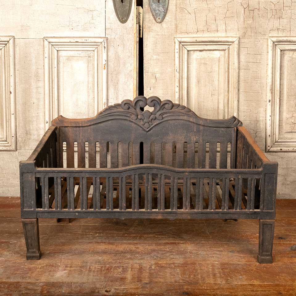 Architectural salvage antique cast iron fireplace log holder with pivoting ash panel measuring approx. 29 3/4" wide x 17 3/4" tall x 13 1/2" front to back. See photos to evaluate condition.