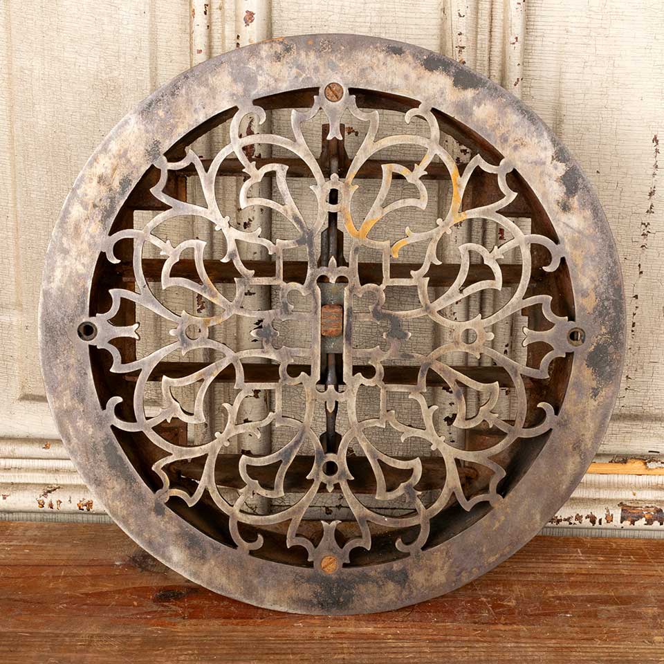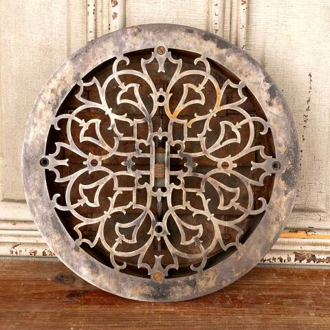 Architectural salvage antique ornate cast iron round heat grate wall / floor vent cover with operable louvers measuring approx. 12" in diameter (insert dimensions) and 13 3/4" in diameter (outside dimensions). Marked on the bottom PATENTED SEPT. 7. 1875. TUTTLE & HAILEY M.F.G. CO. NEW YORK. See photos to evaluate condition.