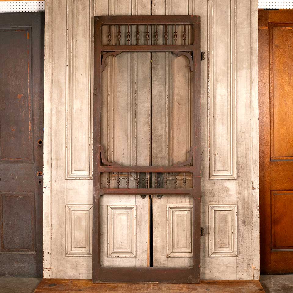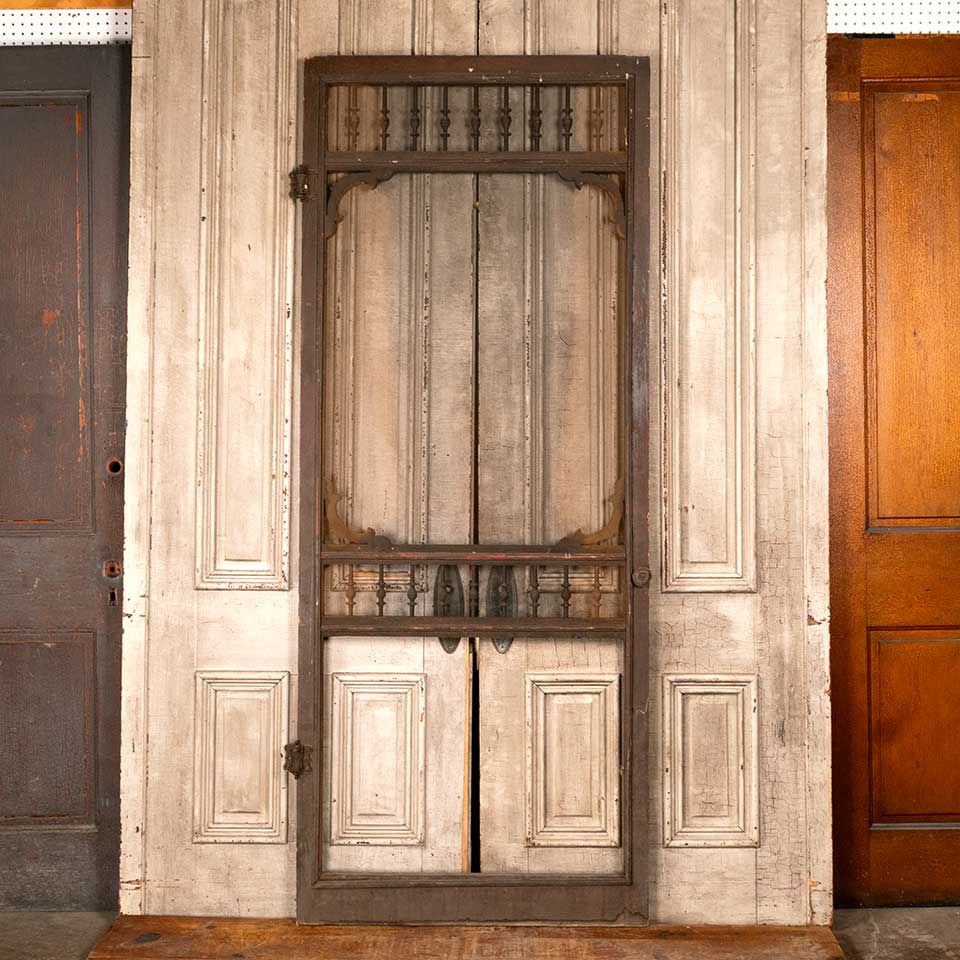 Architectural salvage antique Victorian wood screen door with spring hinges measuring approx. 35 1/2" wide x 88" tall x 1 1/8" thick. The screen is missing from the bottom panel. See photos to evaluate condition.