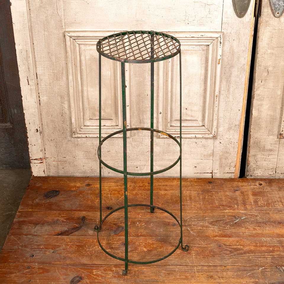 Vintage metal flower pot stand measuring approx. 29 1/4" tall with a 9 3/8" diameter top and a 13 3/4" diameter base. See photos to evaluate condition.