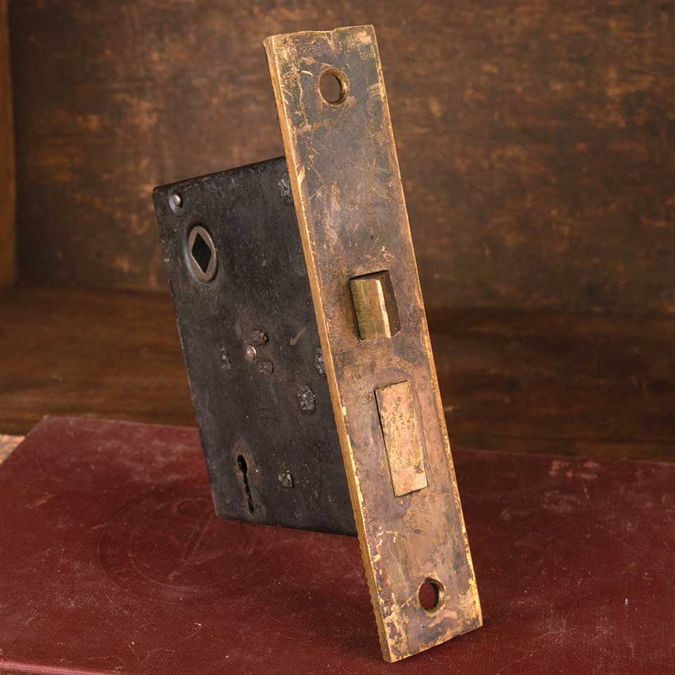 Architectural salvage antique brass and cast iron Russell & Erwin reversible interior door mortise latch lock hardware with skeleton keyhole deadbolt. Measurements: faceplate 1 1/8" wide x 5 1/2" tall x 1/8" thick and body 5/8" wide x 3 1/2" tall x 3 1/16 front to back with a 2 1/2" backset. Spindle and keyholes measure 2 1/2" on center. Key and strike plate NOT included. Color and condition vary, see photos to evaluate. Priced at $20/each.