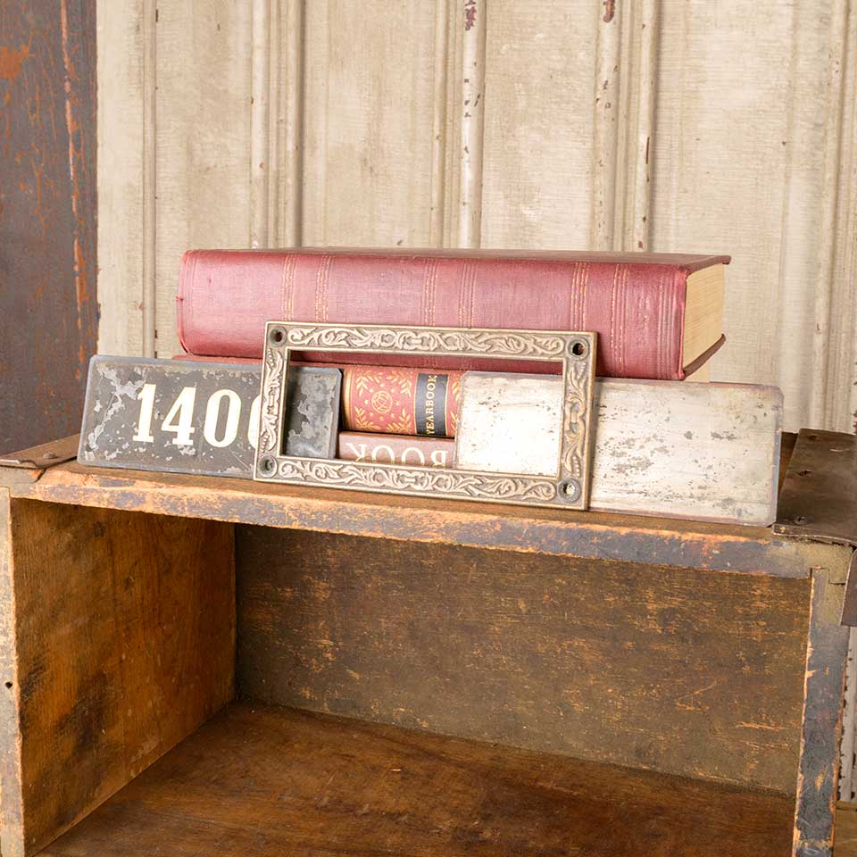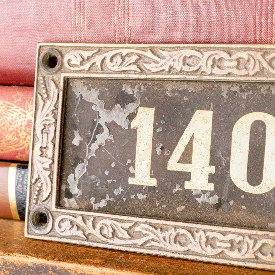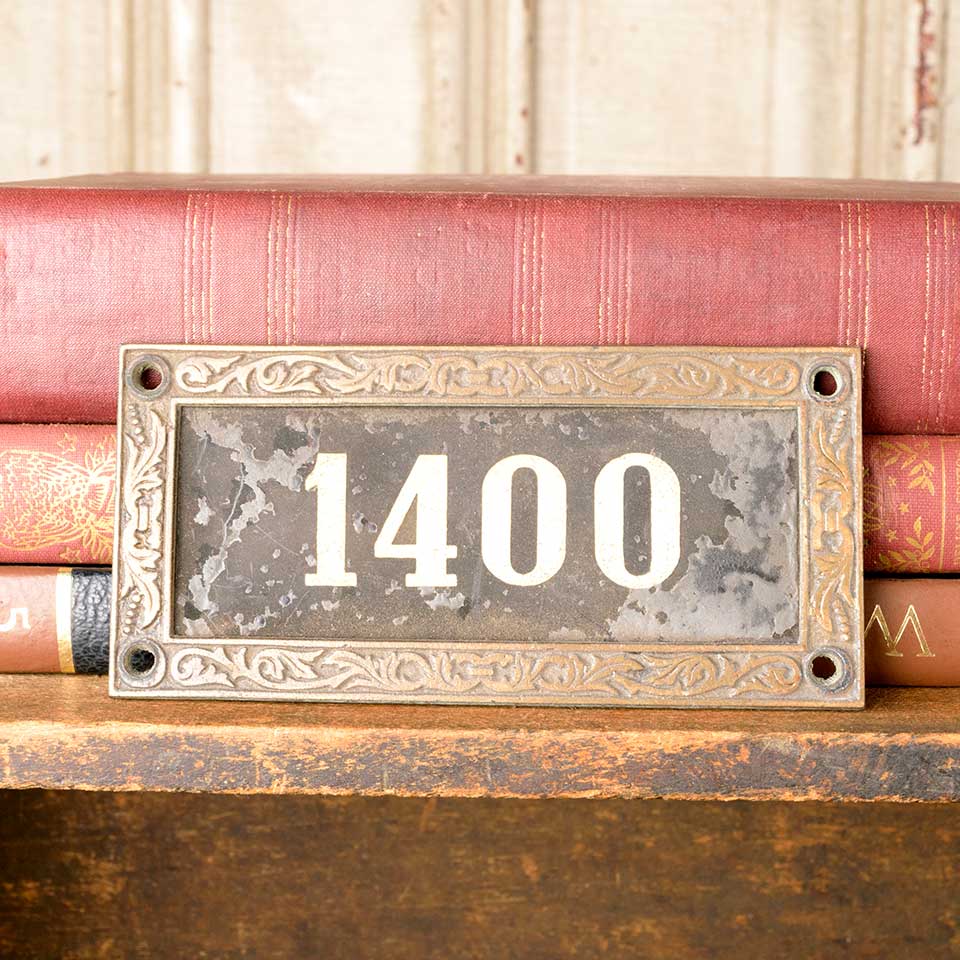 Architectural salvage antique brass frame with removable number 1400 plaque measuring approx. 5 1/2" wide x 2 3/4" tall x 1/8" front to back. See photos to evaluate condition.