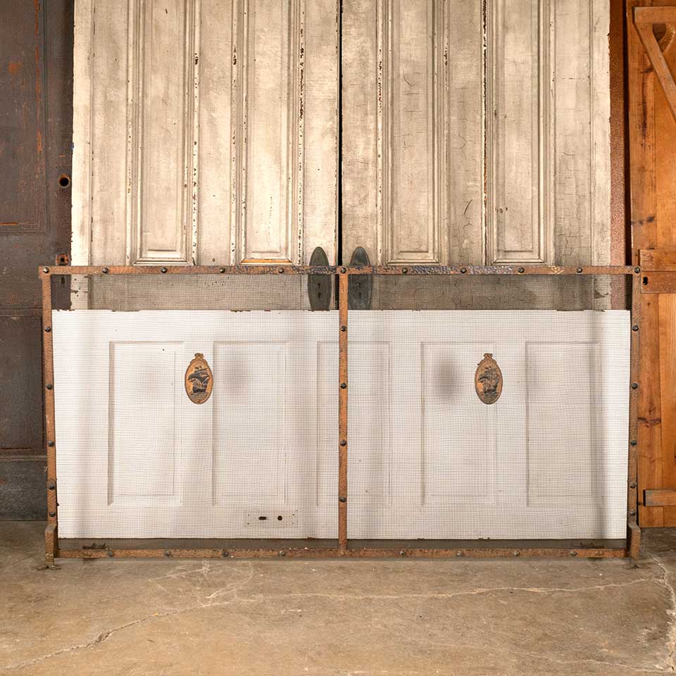 Architectural salvage large freestanding antique metal fireplace screen with nautical motif measuring approx. 72" wide (73 3/4" including feet) x 36 1/8" tall x 8 1/4" front to back (overall). See photos to evaluate condition.