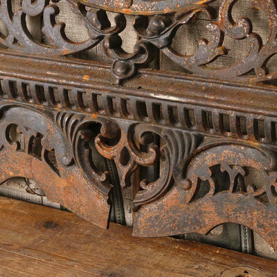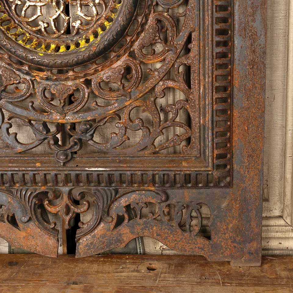 Architectural salvage antique ornate arched top cast iron fireplace summer front cover measuring approx. 22 7/8" wide x 28 3/4" tall x 1" front to back. A piece at the bottom may have been cut out at some point in its history. See photos to evaluate condition.