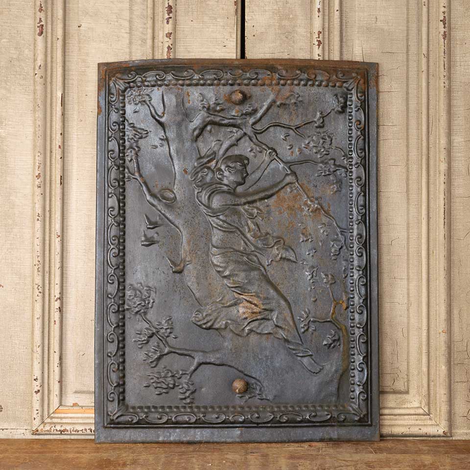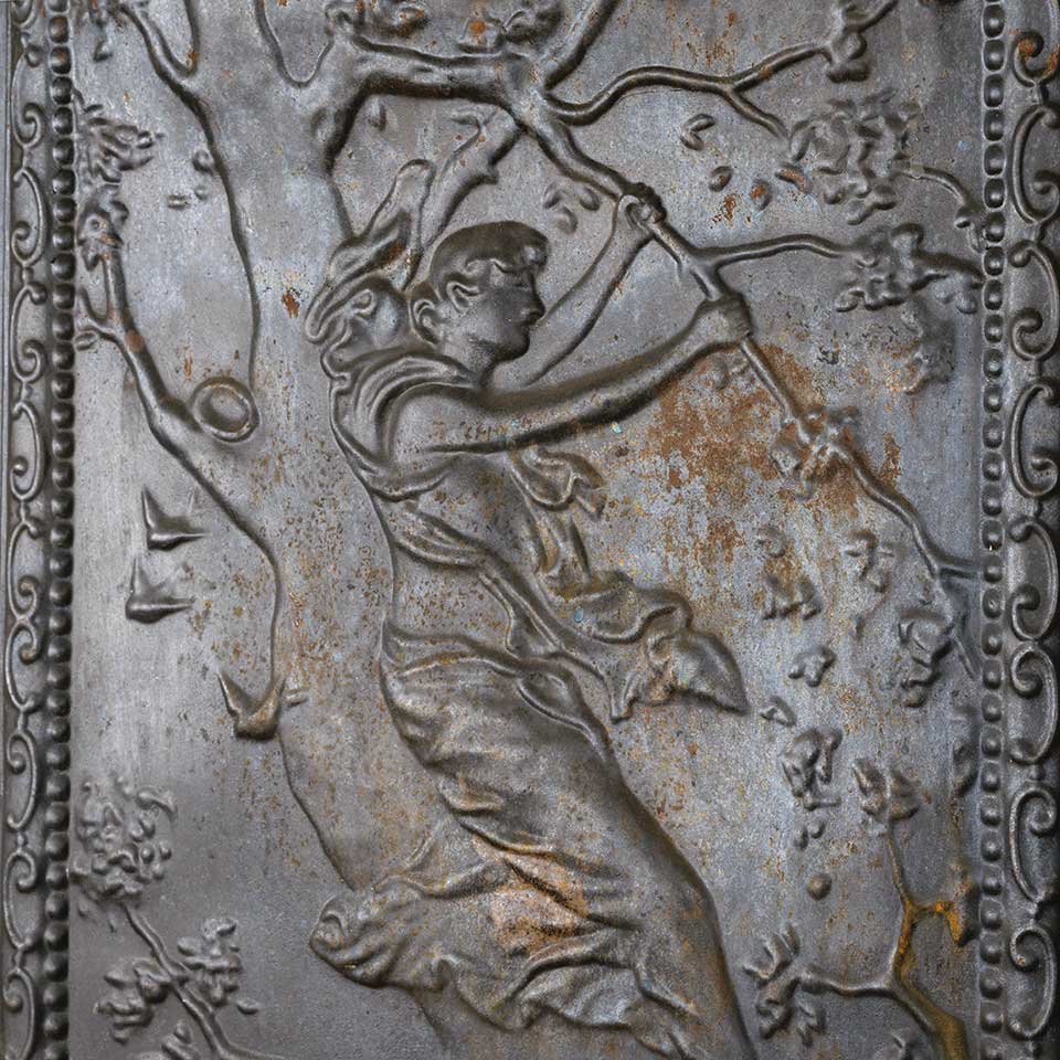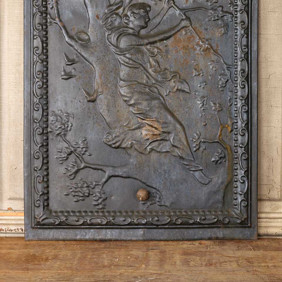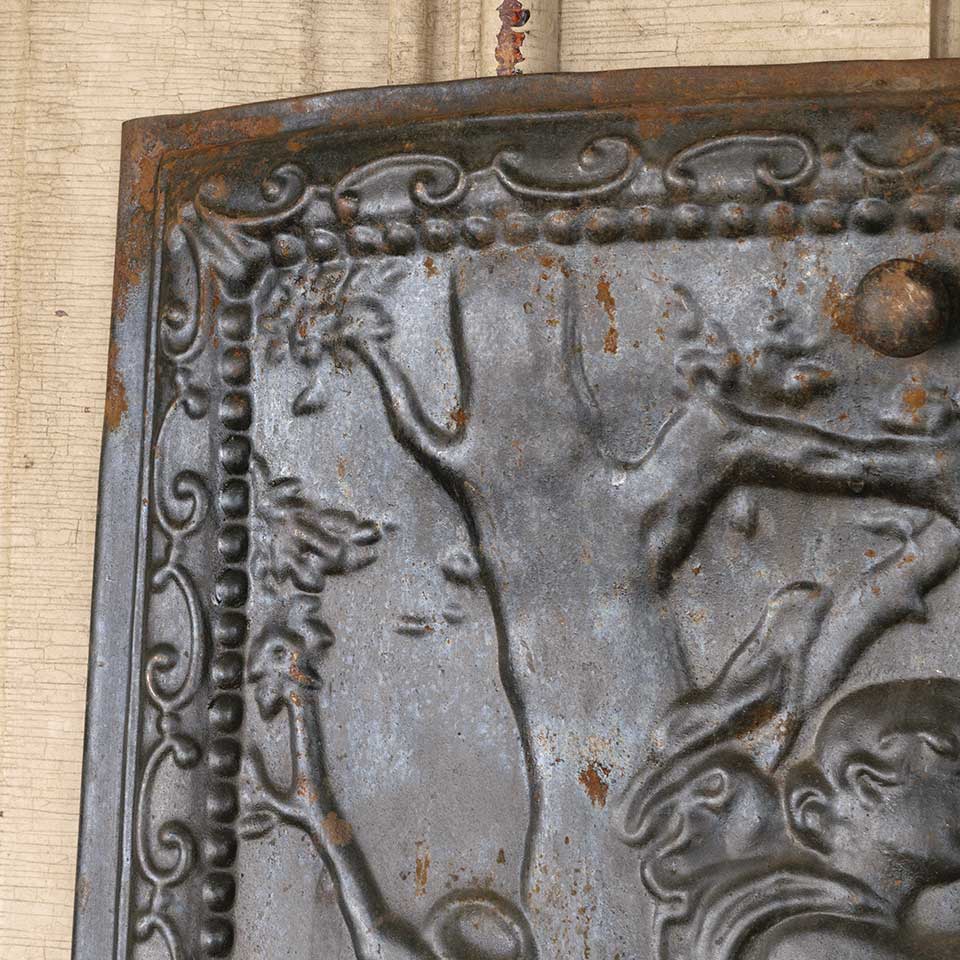 Architectural salvage antique stamped / pressed metal fireplace summer front cover with figural motif measuring approx. 19 7/8" wide x 26 3/4" tall x 2" front to back. See photos to evaluate condition.