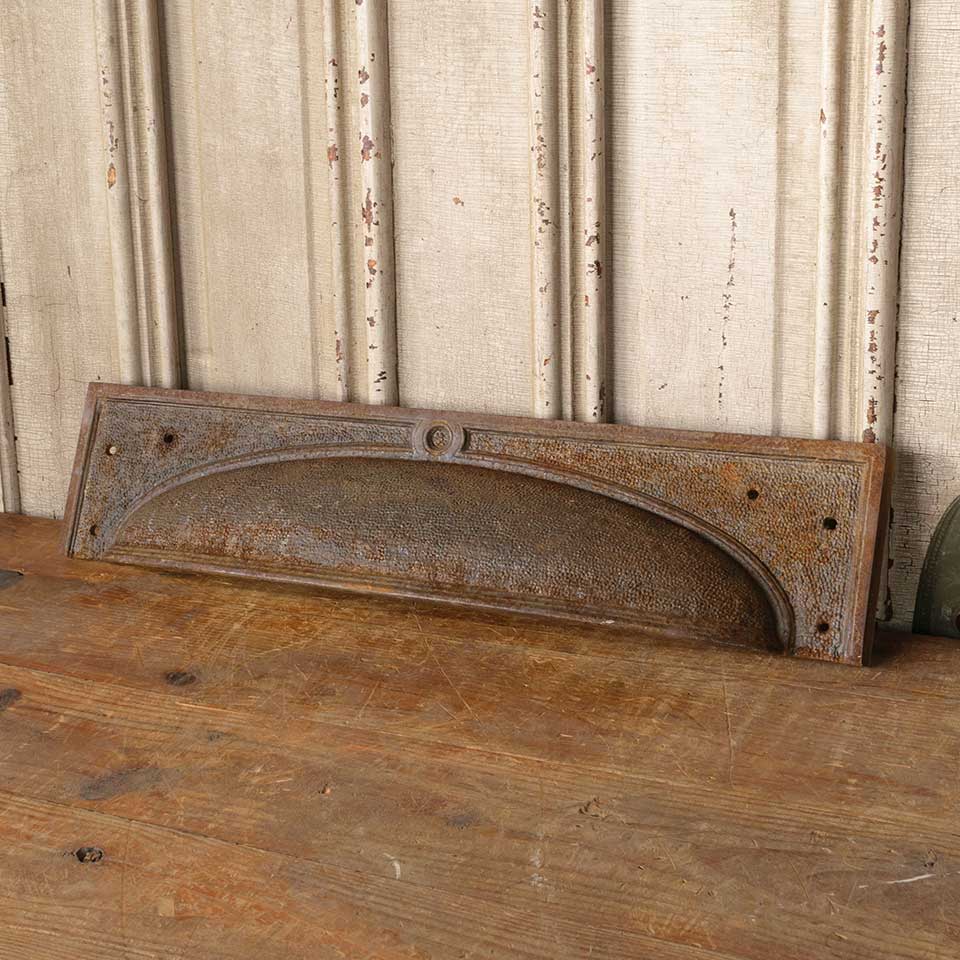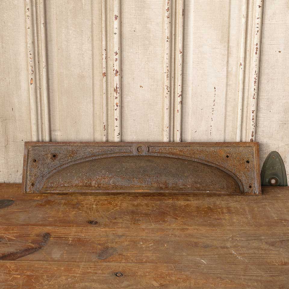 Architectural salvage antique cast iron fireplace surround hood measuring approx. 24 5/8" wide x 5 3/8" tall x 3 1/2" front to back. See photos to evaluate condition.
