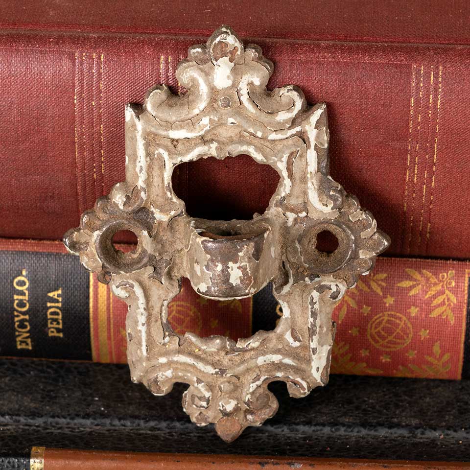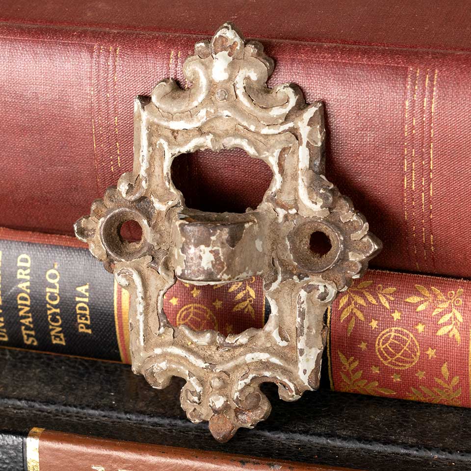 Antique architectural salvage ornate cast iron swivel arm oil lamp wall mount bracket hardware measuring approx. 2 3/8" wide x 3 1/8" tall x 3/4" front to back with a 1/4" diameter opening. See photos to evaluate condition.