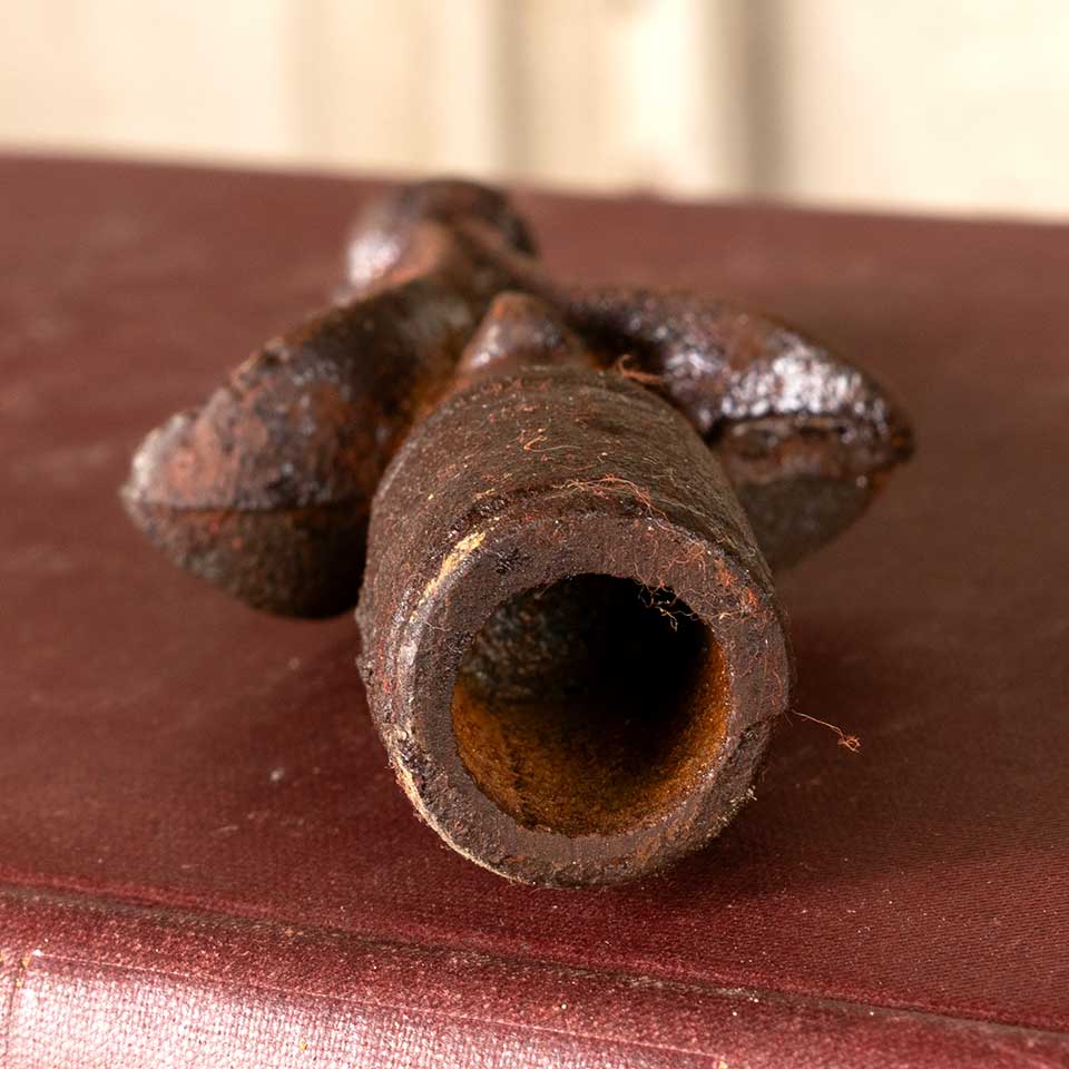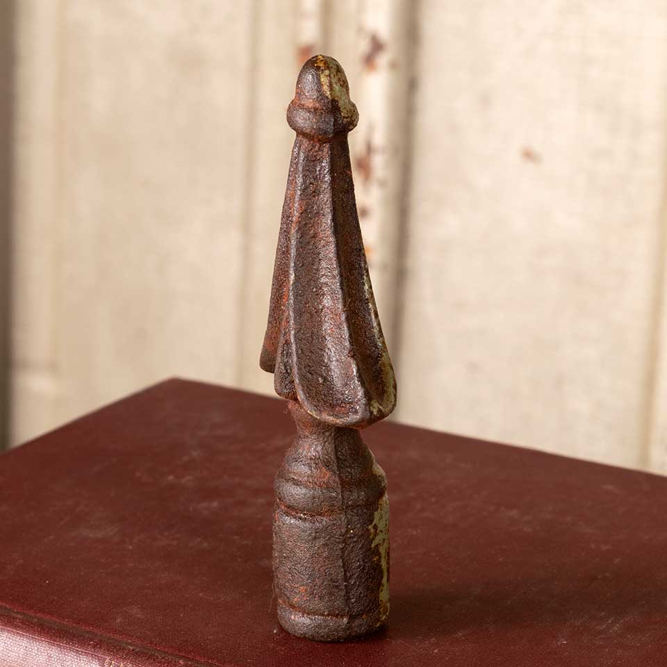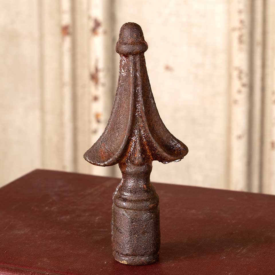 Architectural salvage antique cast iron fence post finial ornament measuring approx. 1 7/8" wide x 4 1/4" tall x 7/8" front to back. The base measures 7/8" in diameter with opening of 5/8" in diameter. Color and condition may vary, see photos to evaluate. Priced at $10/each.
