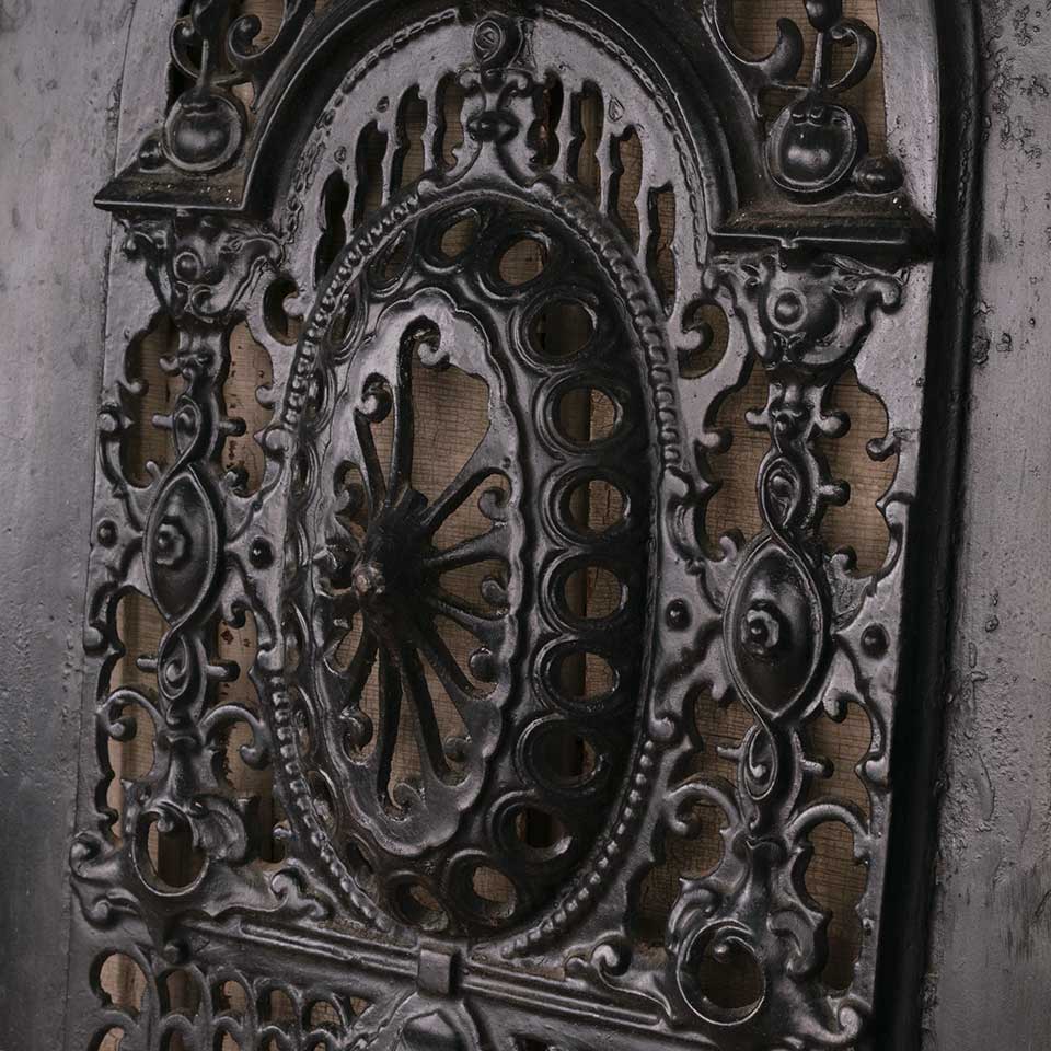 Architectural salvage antique ornate arched top cast iron fireplace summer front cover measuring approx. 19 7/16" wide x 26 1/2" tall x 2" front to back. There looks to be a piece missing from the center medallion. See photos to evaluate condition.