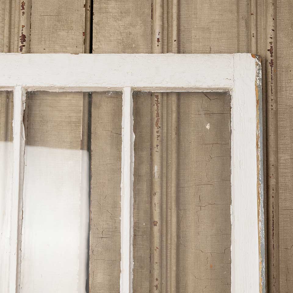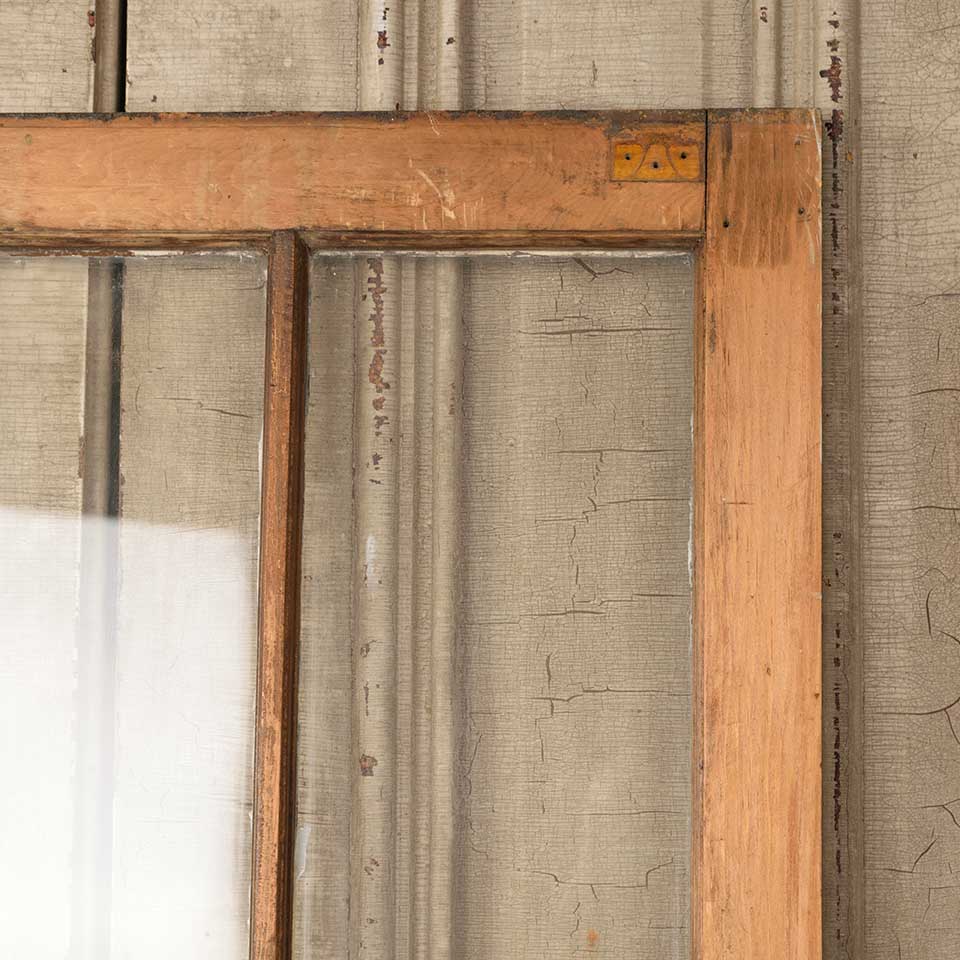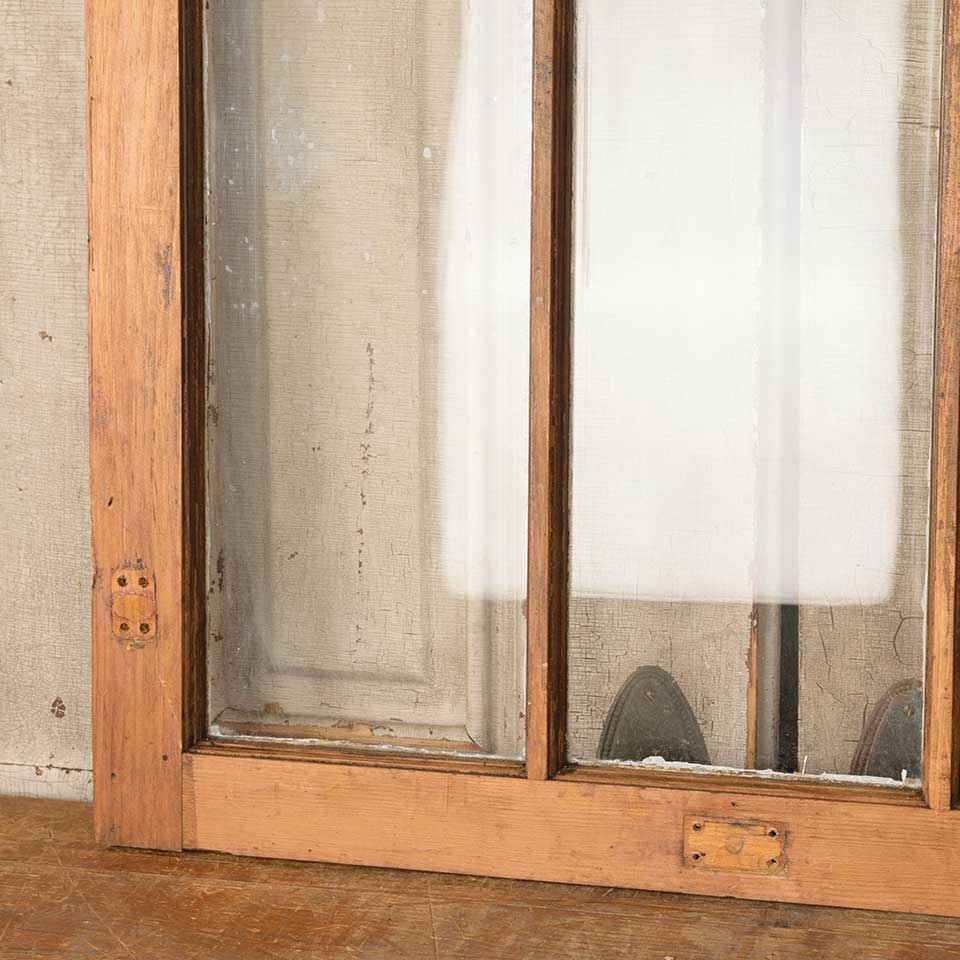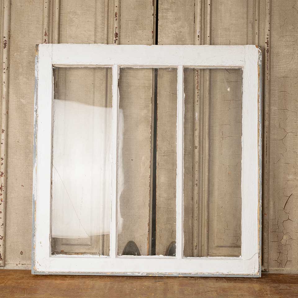 Architectural salvage antique divided three lite wood window sash measuring approx. 28 3/8" wide x 28 1/2" tall x 1 3/8" thick. There's one cracked pane. See photos to evaluate condition.