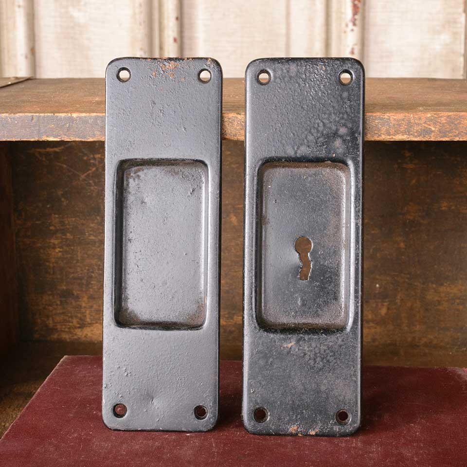 Pair of architectural salvage antique metal pocket door hardware pulls each measuring approx. 2 /8" wide x 6 5/8" tall with a recessed area 1 5/8" wide x 3" tall (1 plate with keyhole & 1 without). See photos to evaluate condition. Priced at $95 for the pair.