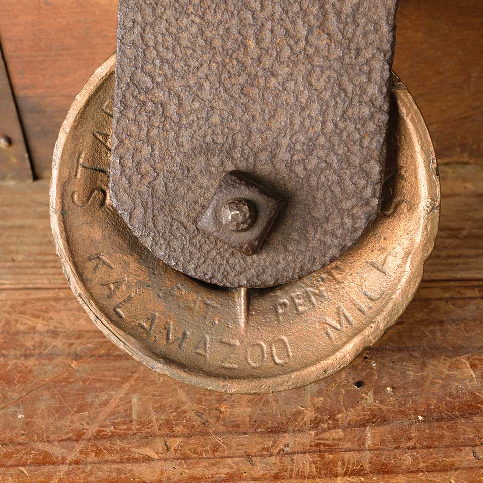 Architectural salvage antique cast iron and brass barn pulley measuring approx. 4 3/8" wide x 9 3/4" tall x 3 3/8" front to back. The wheel is marked: "STAR BRASS WORKS KALAMAZOO MICH PAT. PEN'D". See photos to evaluate condition.
