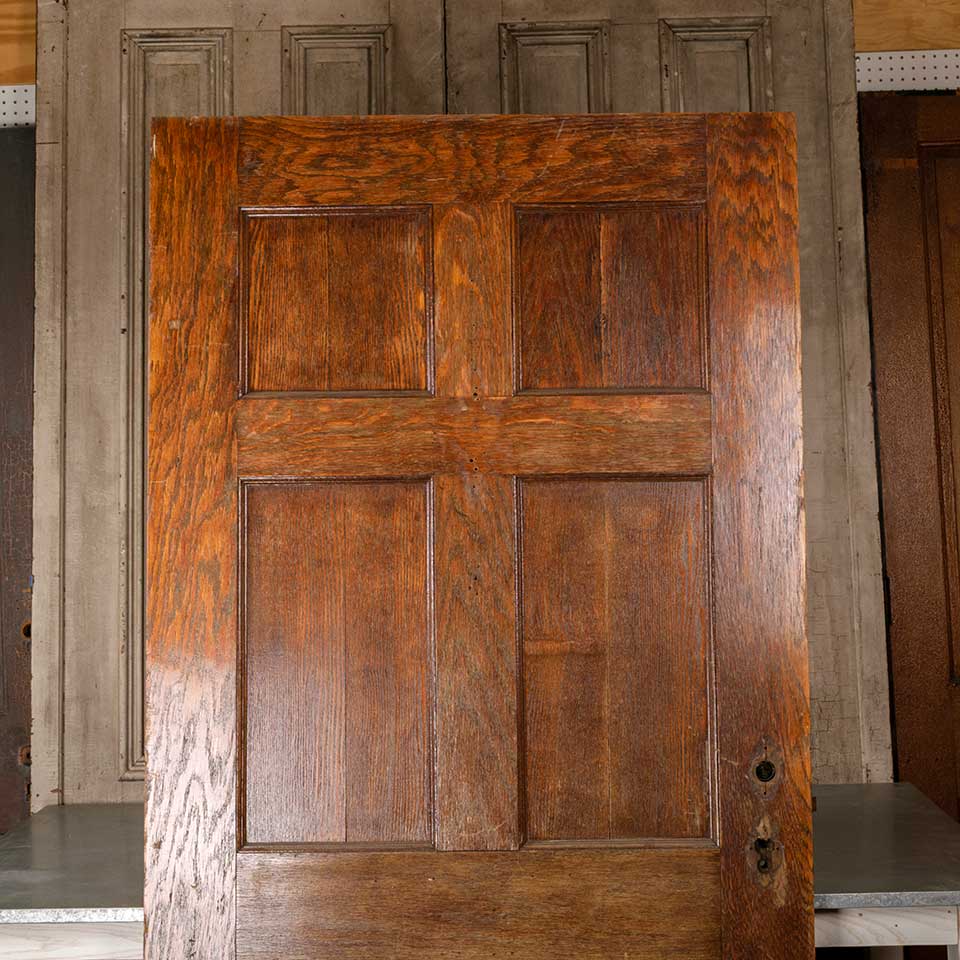 Architectural salvage antique oak six panel entry door with mortise lock measuring approx. 41 5/8" wide x 83 1/4" tall x 1 3/4" thick. all of the panels have a vertical split and there's missing and loose veneer at the bottom. See photos to evaluate condition.