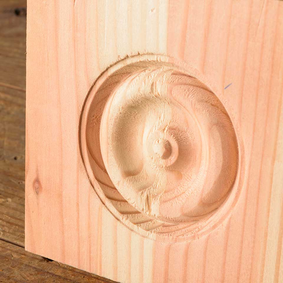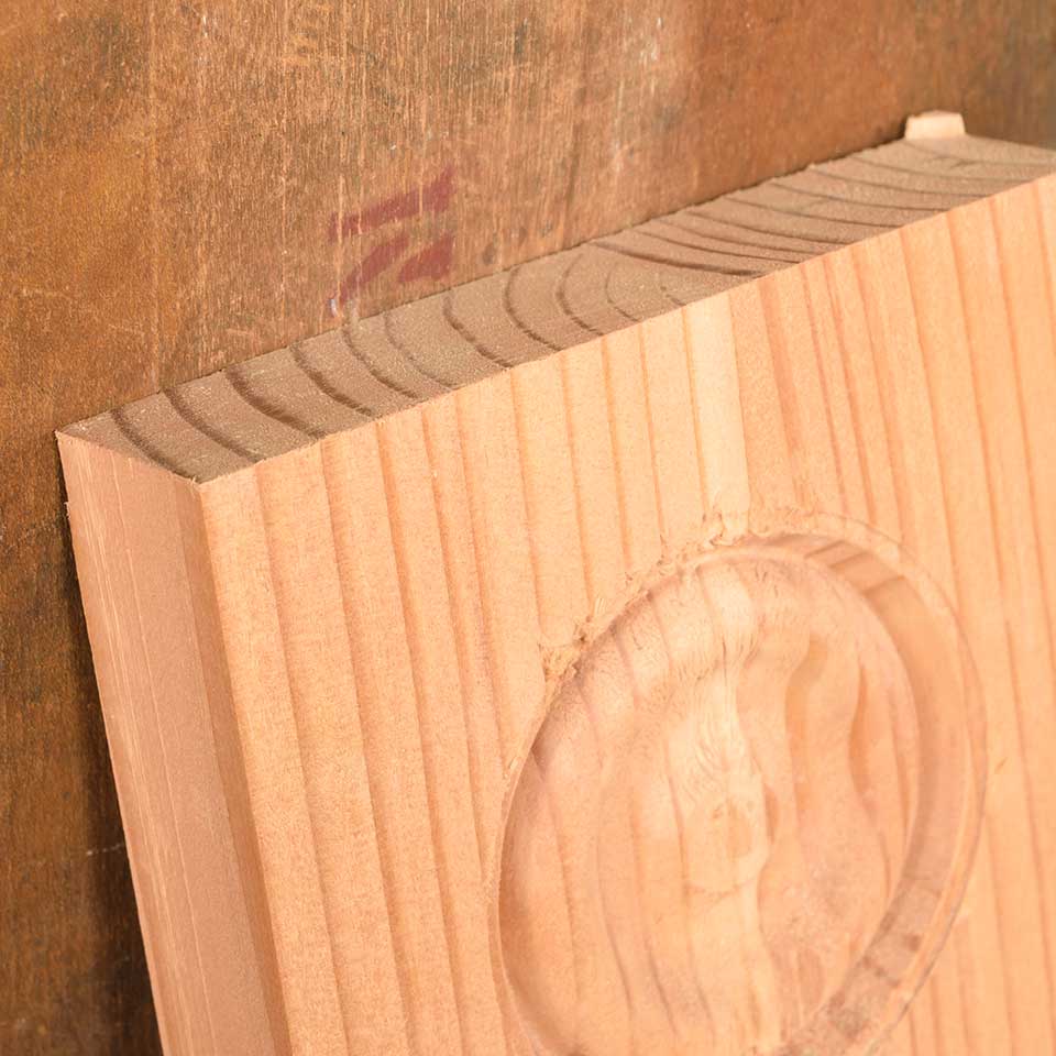 Reproduction pine wood interior rosette door or window trim block measuring approx. 5 5/8" x 5 5/8" x 1 1/4" front to back. Color and condition vary. Priced at $15/each.