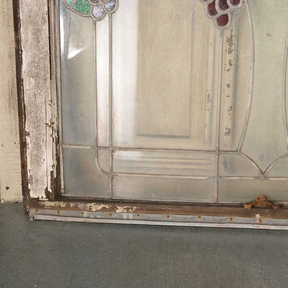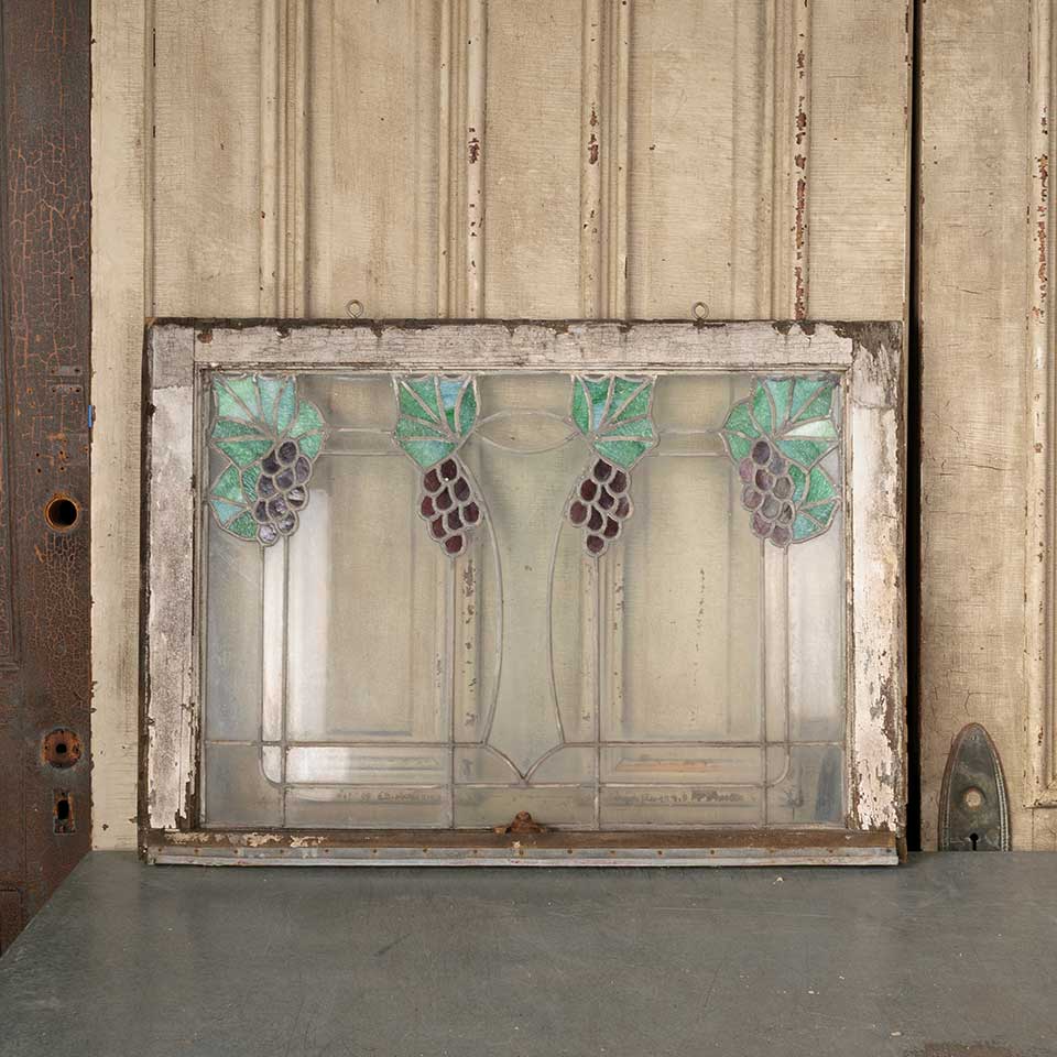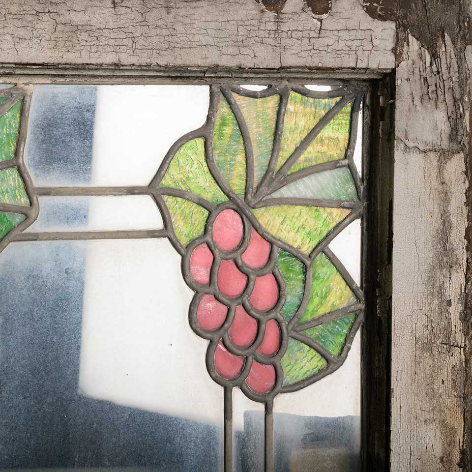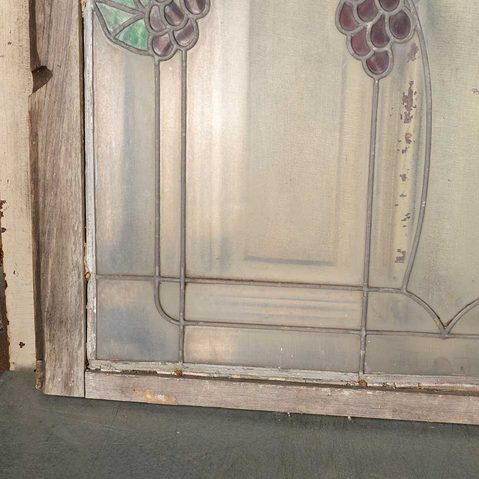 Architectural salvage antique stained glass window with grape motif measuring approx. 32 1/2" wide x 23" tall x 1 1/2" front to back. There's some bowing of the glass and some wood loss on the sash. See photos to evaluate condition.