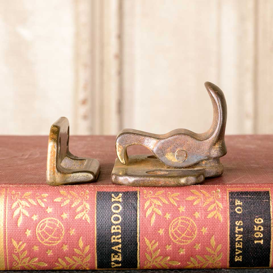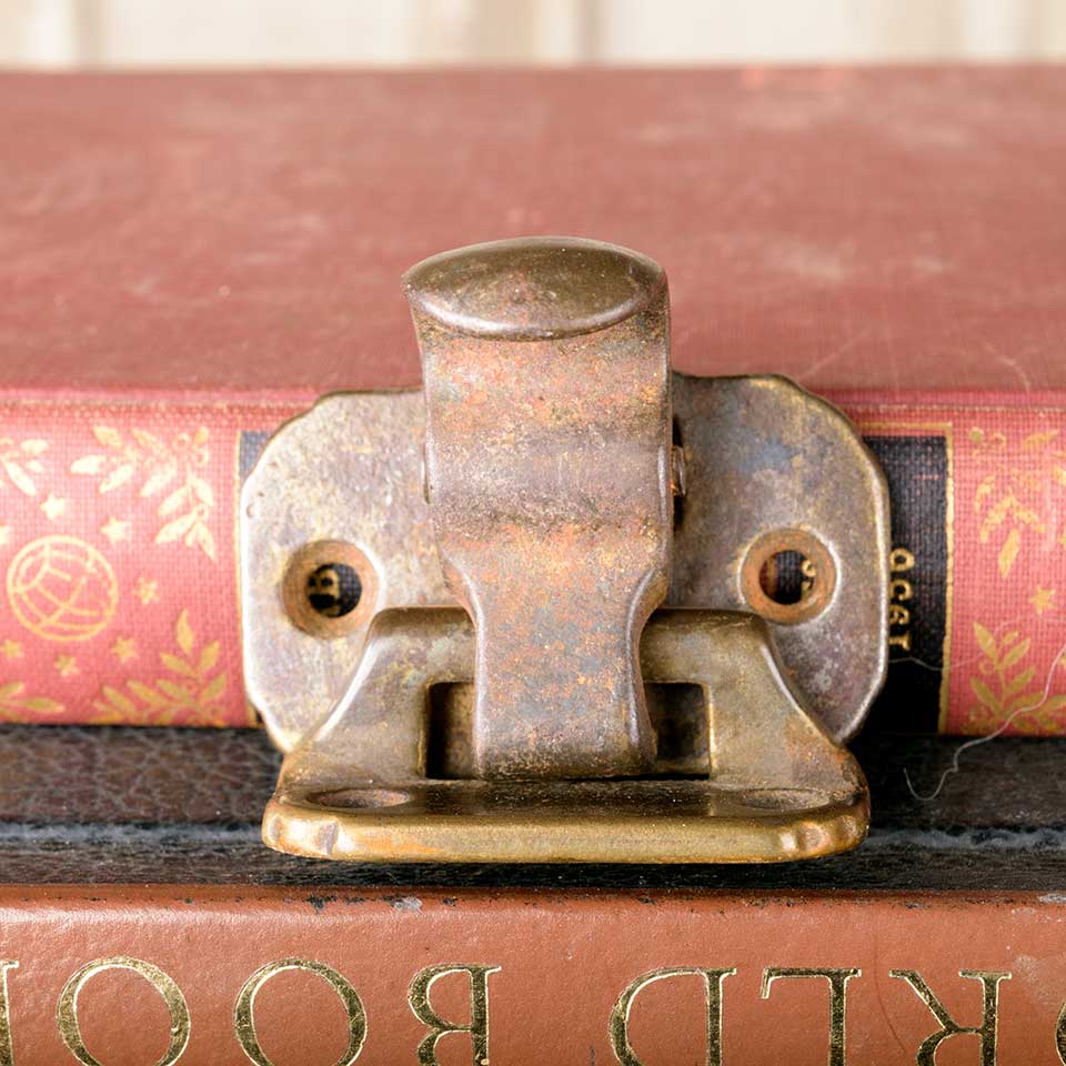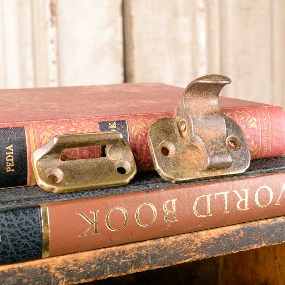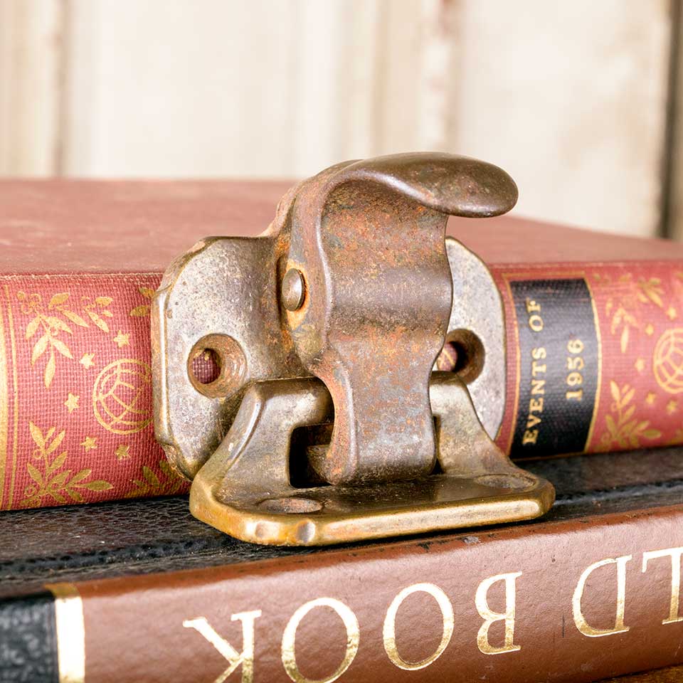 Architectural salvage antique cast iron window sash lift and lock hardware set. The lift / lock measures approx. 2" wide x 1 1/2" tall x 1 1/4" front to back. The keeper measures approx. 1 3/4" wide x 5/8" front to back. Color and condition may vary. Priced at $30/set.