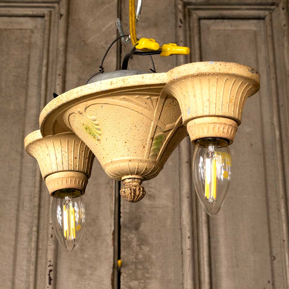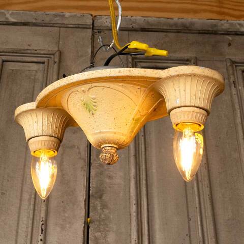 Architectural salvage antique cast metal 2 bulb ceiling light fixture measuring approx. 12 3/8" wide x 6 1/2" front to back with a 3 3/4" drop. See photos to evaluate condition. Salvaged lighting should be inspected by a licensed electrician prior to installation.