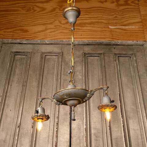Architectural salvage antique Victorian two bulb chandelier light fixture measuring approx. 18 3/4" wide x 30" tall x 9" front to back. See photos to evaluate condition. Salvaged lighting should be inspected by a licensed electrician prior to installation.