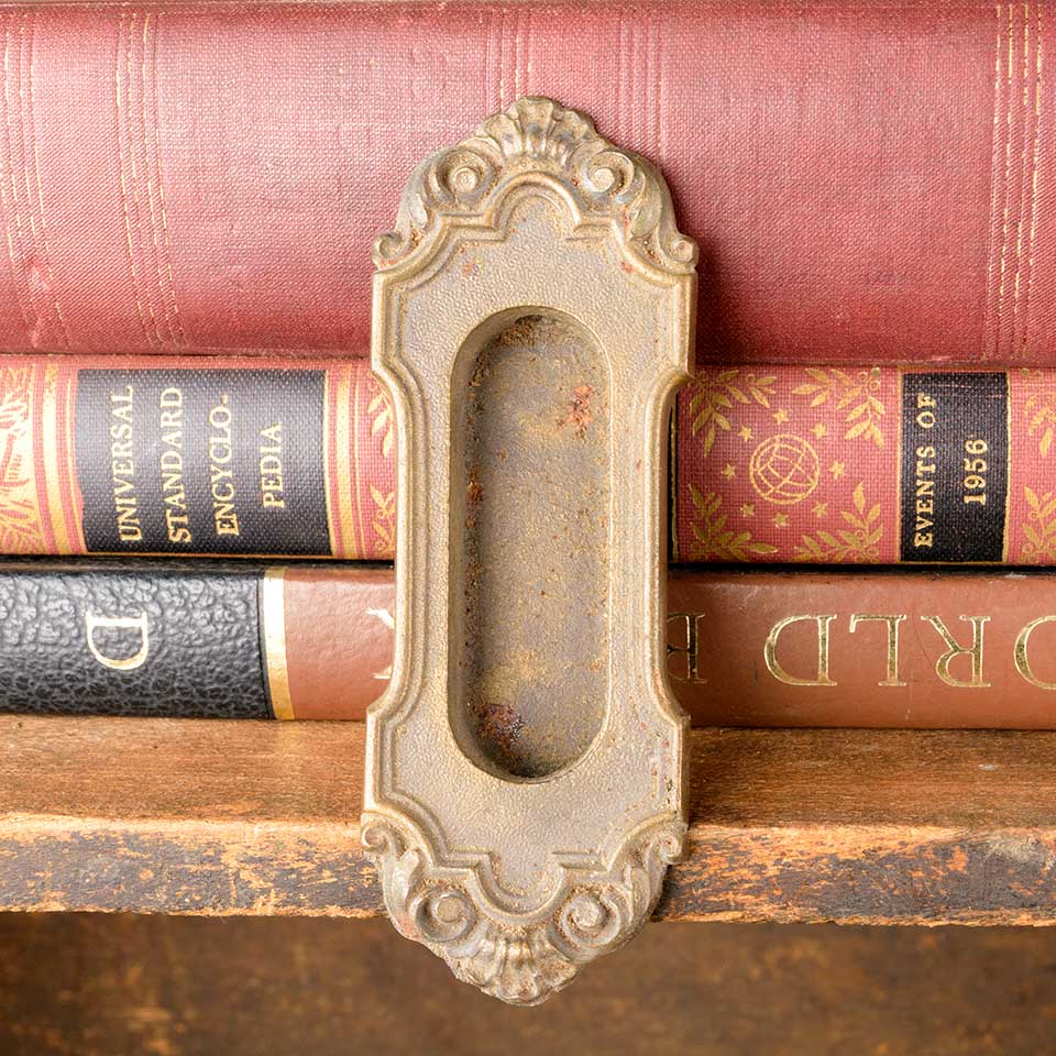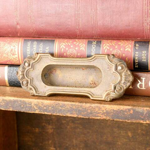 Architectural salvage antique ornate cast iron window sash lift hardware measuring approx. 4 1/2" wide x 1 1/2" tall x 5/8" front to back. The recessed area measures approx. 2 1/4" wide x 13/16" tall. See photos to evaluate condition.