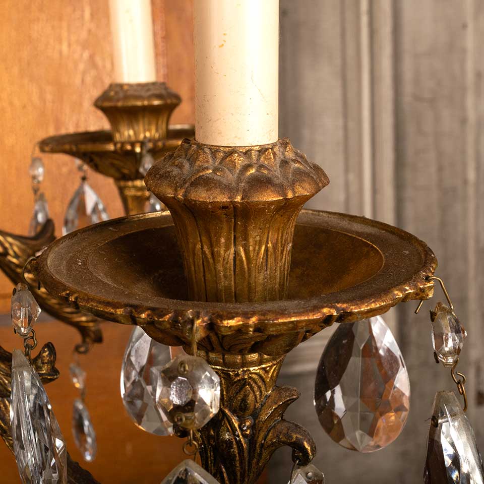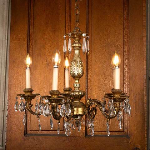 Architectural salvage antique five bulb brass chandelier light fixture with glass prisms measuring approx. 21" in diameter x 33" tall (overall) with a 5" diameter ceiling canopy. See photos to evaluate condition. Salvaged lighting should be inspected by a licensed electrician prior to installation.