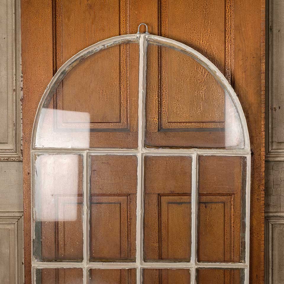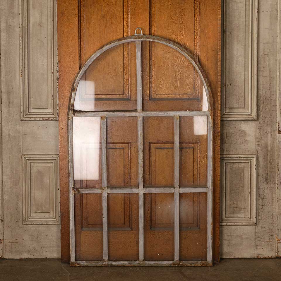 Architectural salvage antique arched top divided lite steel window measuring approx. 34 1/2" wide x 55 3/8" tall x 1 1/4" front to back. See photos to evaluate condition.