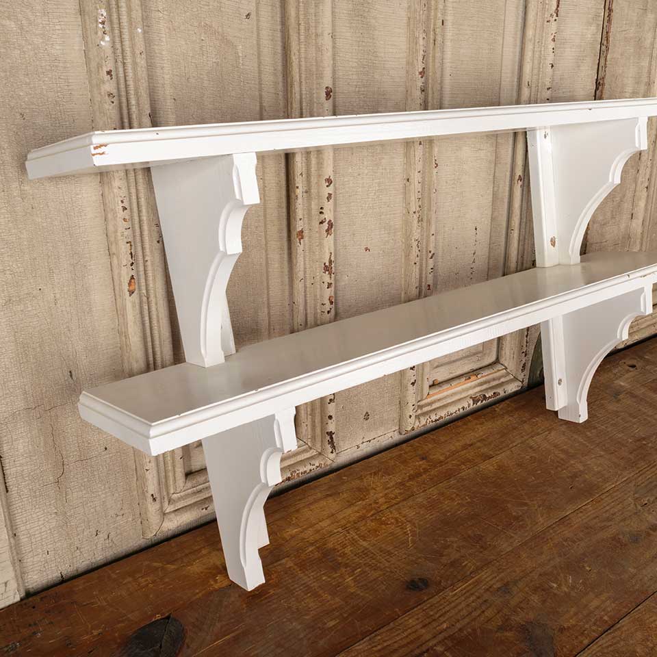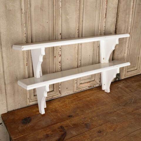 Painted wood two tier wall mount display shelf measuring approx. 30" wide x 17" tall x 6" front to back. This is not an antique. See photos to evaluate condition.