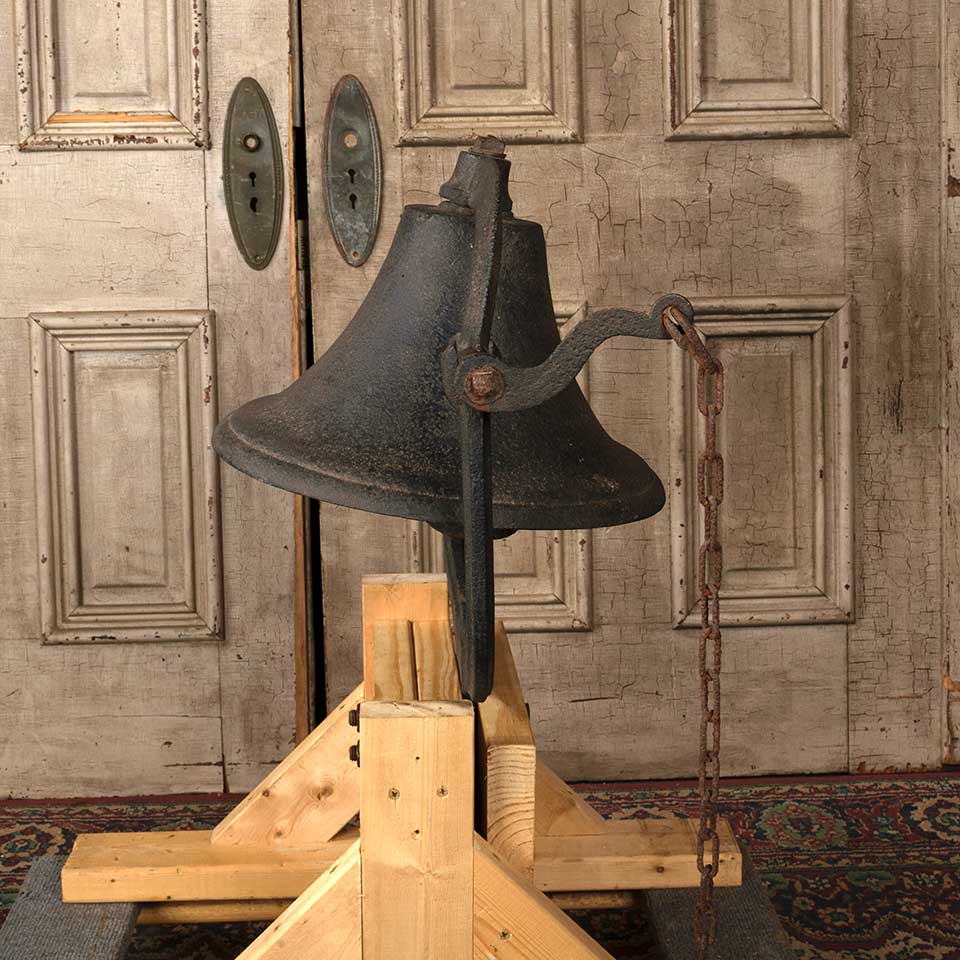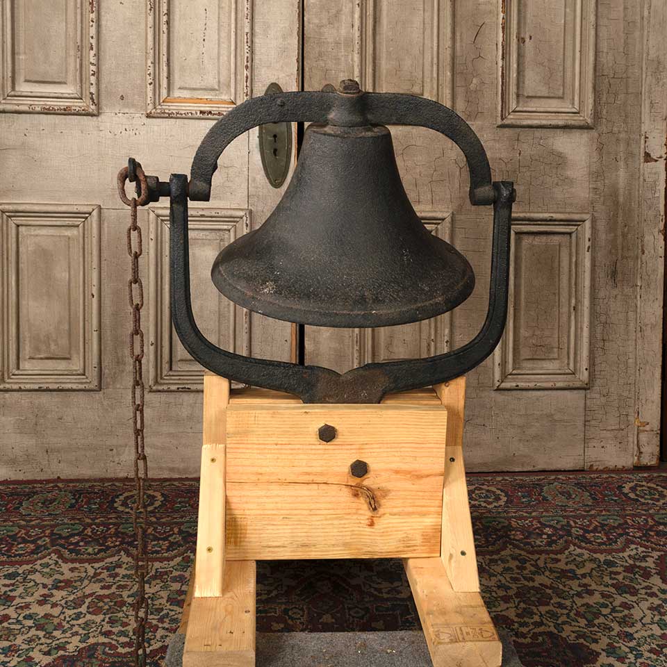 Architectural salvage antique cast iron farmhouse bell with yoke measuring approx. 15 7/8" in diameter x 12" tall. The yoke measures approx. 19 7/8" wide x 18 1/8" tall x 2" front to back. See photos to evaluate condition.