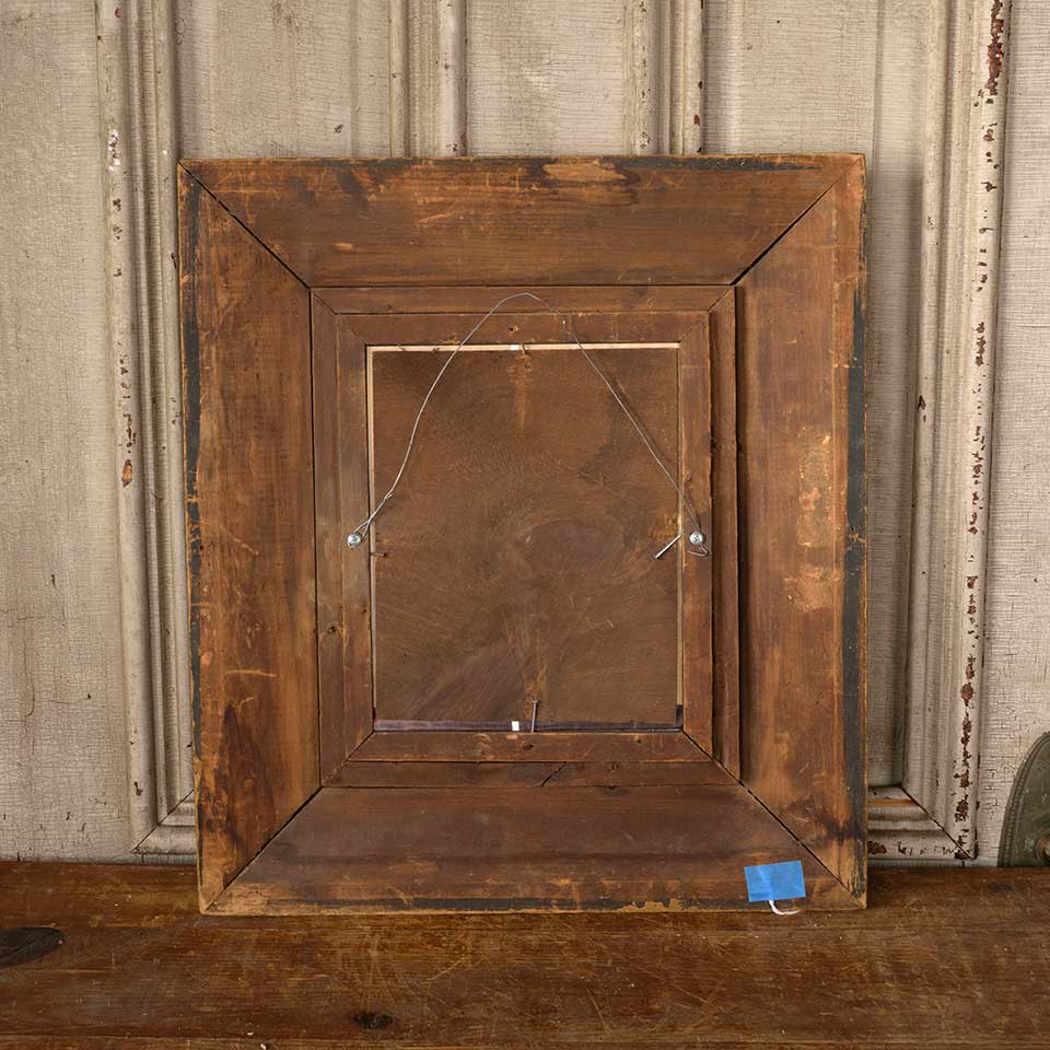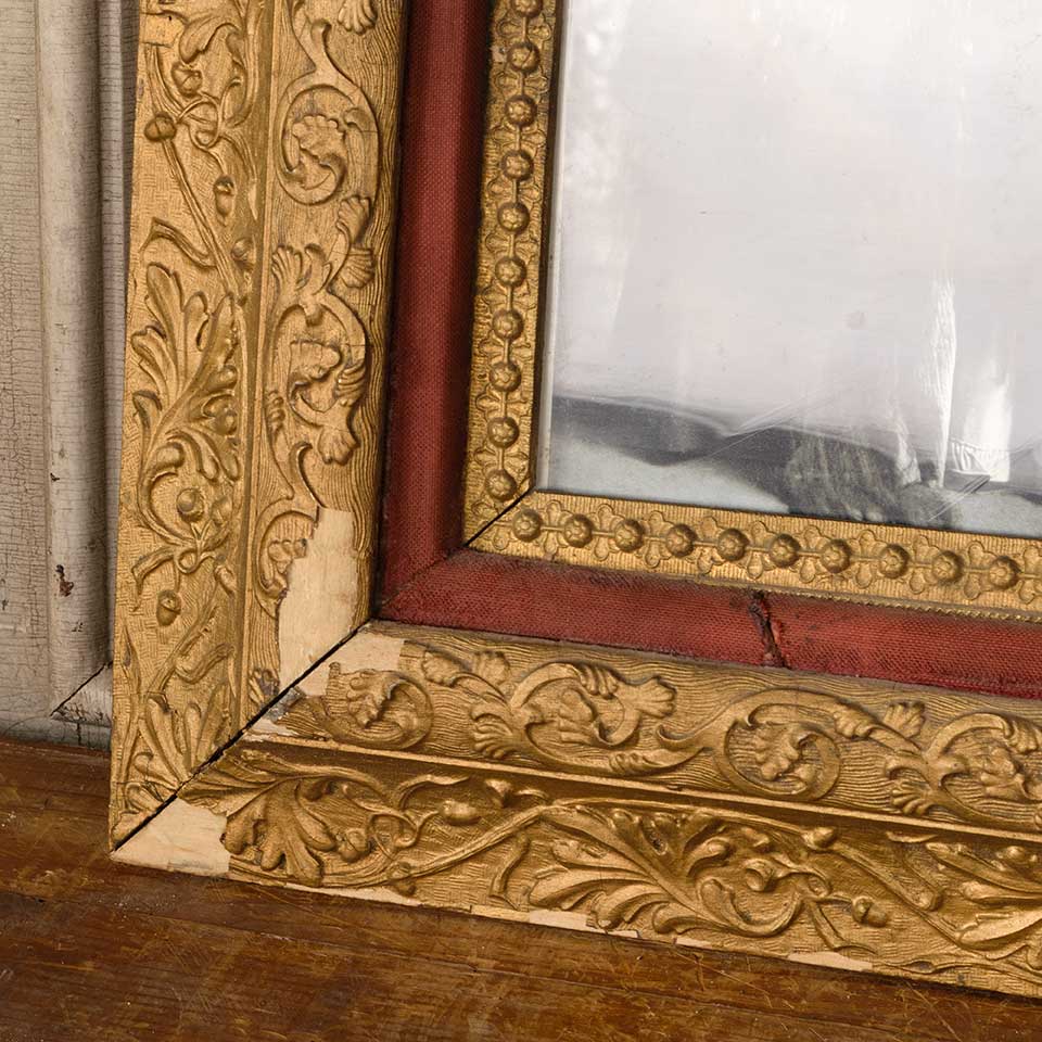 Long haired ladies picture in ornate antique frame measuring approx. 17 3/4" wide x 19 5/8" tall x 1 5/8" front to back. The interior opening measures approx. 7 5/8" wide x 9 5/8" tall. There's some material loss. See photos to evaluate condition.