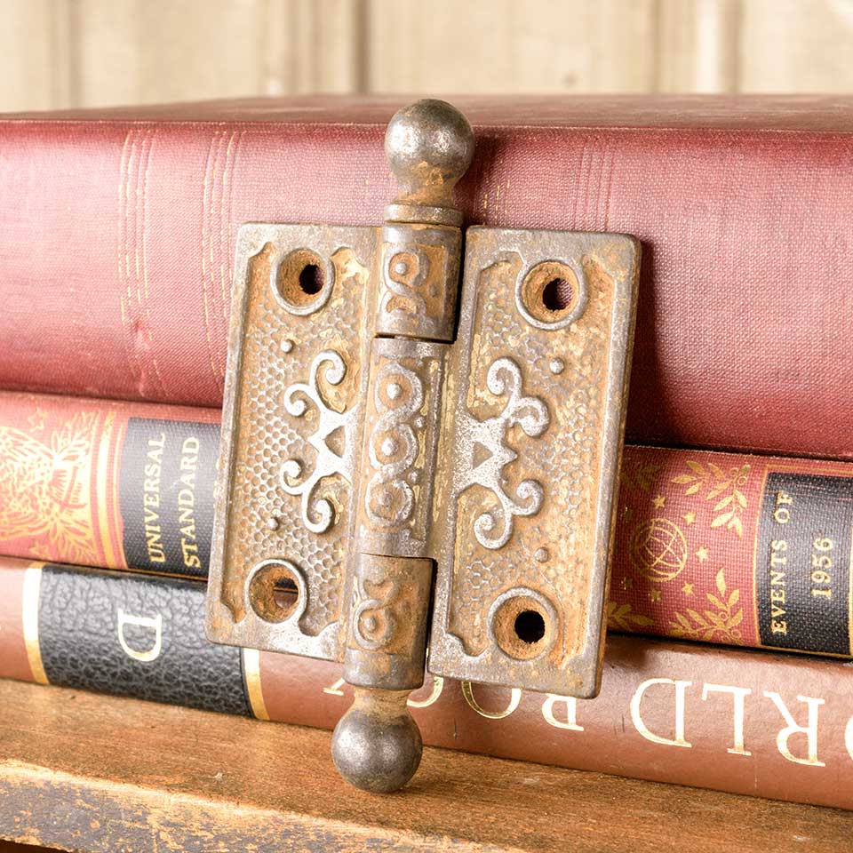 Architectural salvage antique ornate cast iron door hinge hardware with ball finials measuring approx. 2 1/2" x 2 1/2" (3 7/8" tall including finials). See photos to evaluate condition.