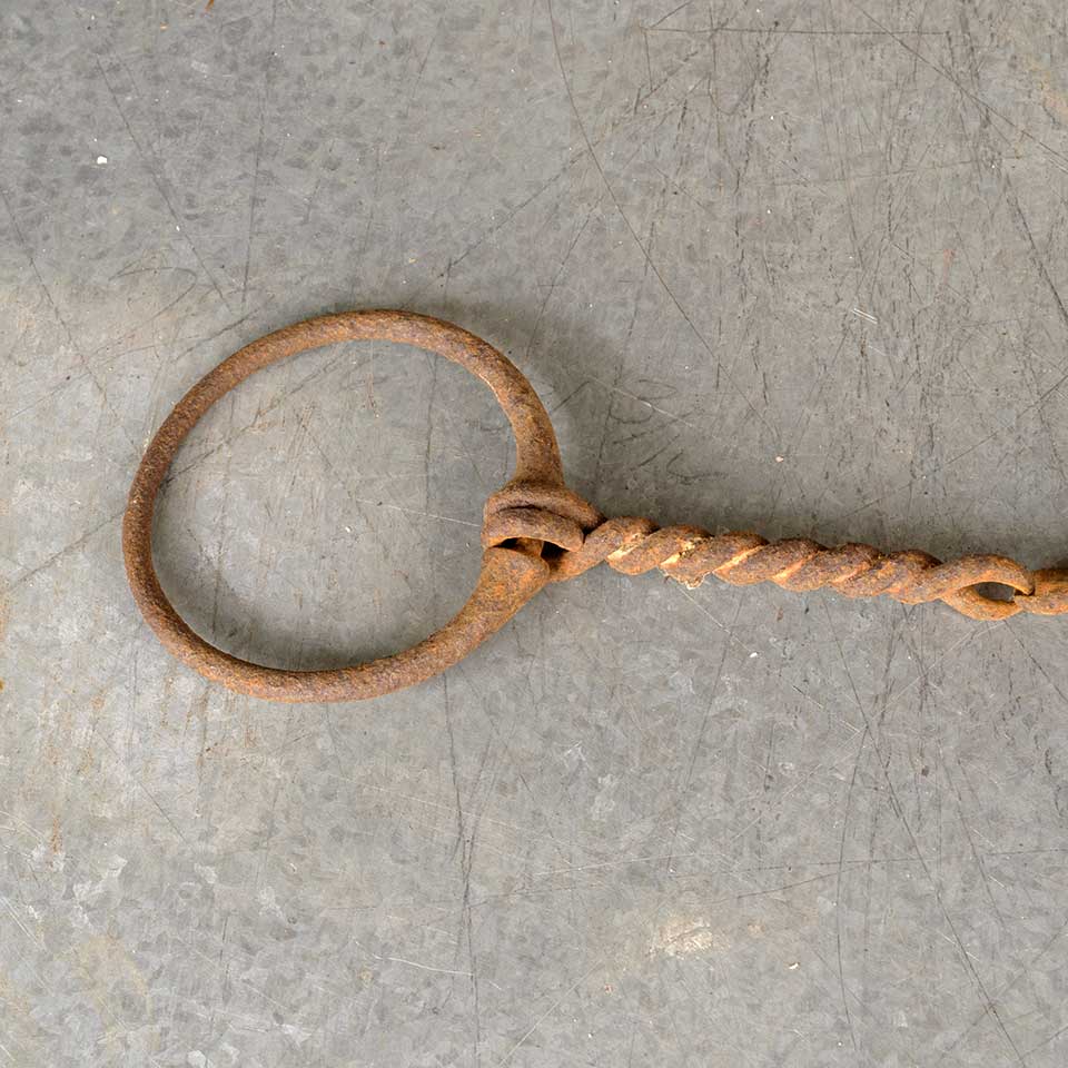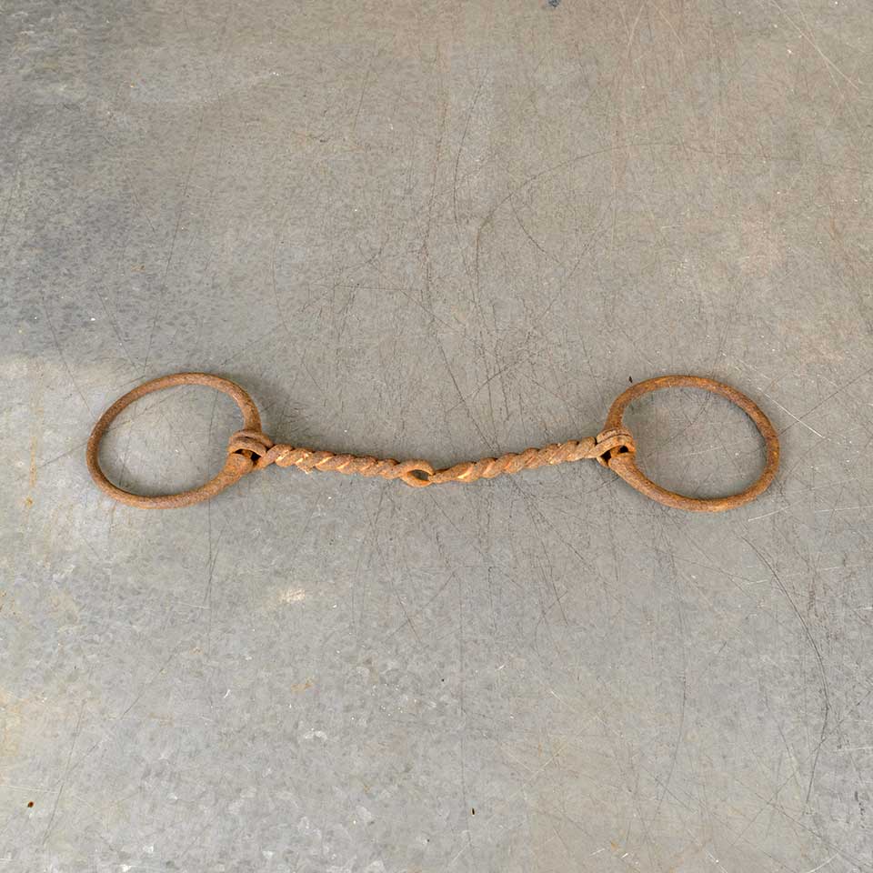 Antique wrought iron snaffle bit for horse riding bridle reins with a 6" mouthpiece and 3" diameter rings. Color and condition vary.