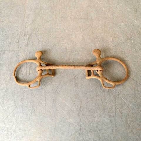 Antique wrought iron snaffle bit for horse riding bridle reins with a 5" mouthpiece and 4" diameter rings (including reins guide). See photos to evaluate condition.