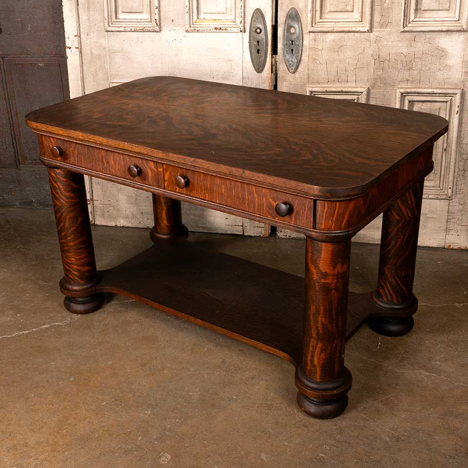 Antique quarter sawn oak library table with drawer measuring approx. 48" wide x 29" tall x 28" front to back. There's a piece of veneer missing on the back of the bottom support piece. See photos to evaluate condition.