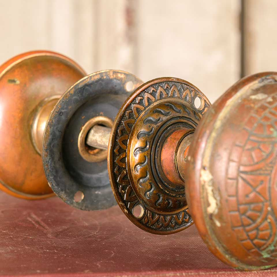 Architectural salvage antique Victorian Reading Hardware Company Windsor pattern c. 1890 doorknob hardware set. The set includes a pair of 2 1/4" diameter doorknobs, a pair of 2" diameter doorknob rosette backplates, and a tapped spindle with set screws. Color and condition may vary. Priced at $225 for the set.