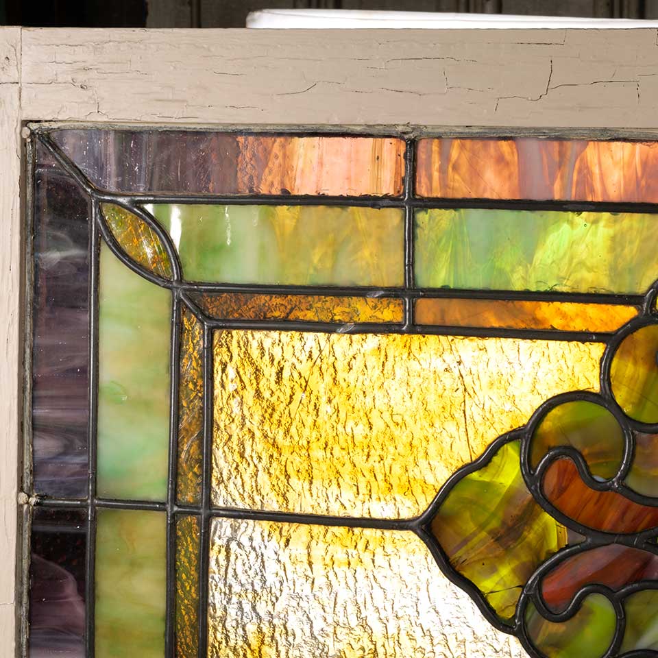 Architectural salvage antique stained glass window measuring approx. 34" wide x 21" tall x 1 3/8" front to back. There are some cracks, but no glass loss. See photos to evaluate condition.