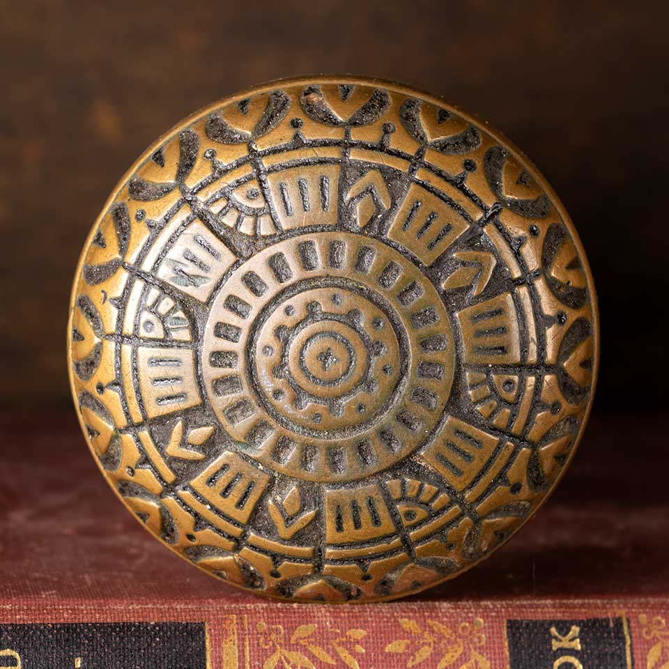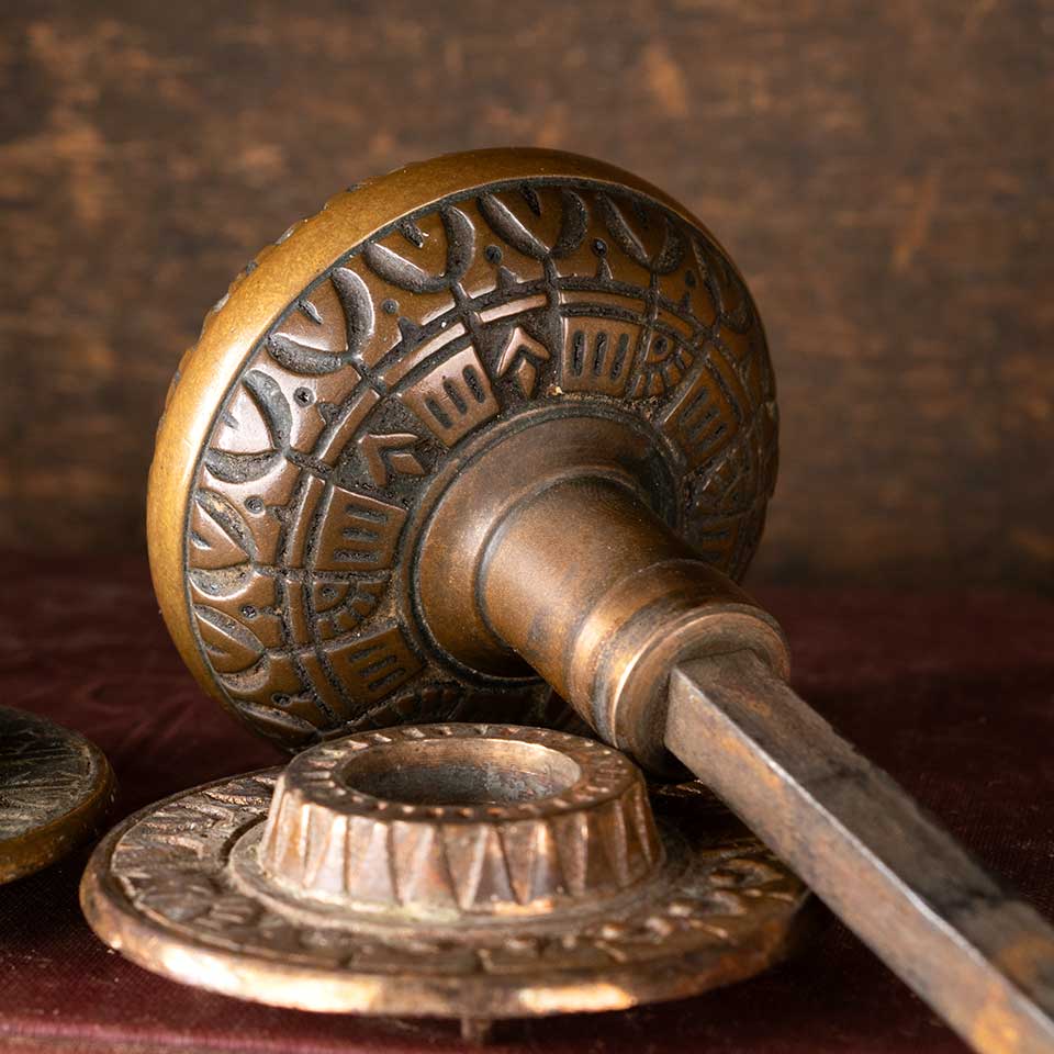 Architectural salvage antique Victorian Peterborough Lock Company (circa 1887) ornate brass doorknobs door hardware set including two matching doorknobs (2 1/4" in diameter), two matching doorknob rosettes (2 1/8" in diameter), and a fixed / threaded doorknob spindle with a sleeve. See photos to evaluate condition. Priced at $250 for the set.