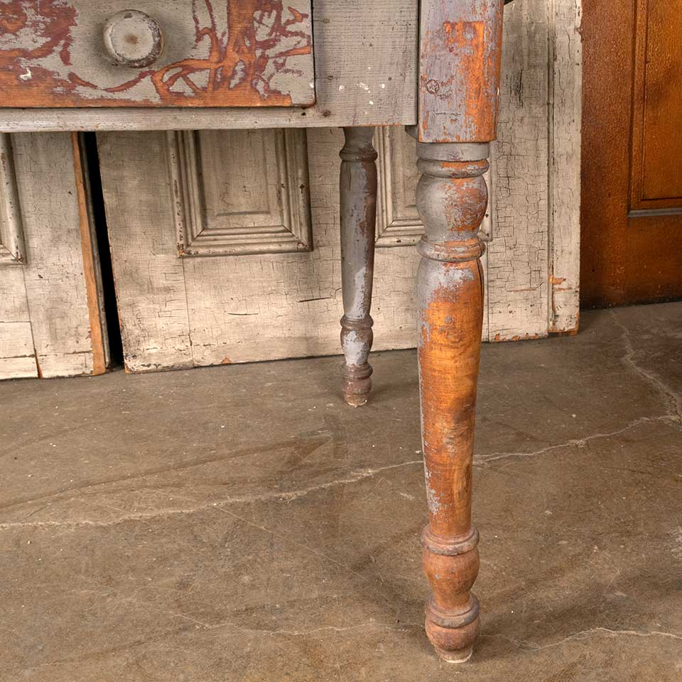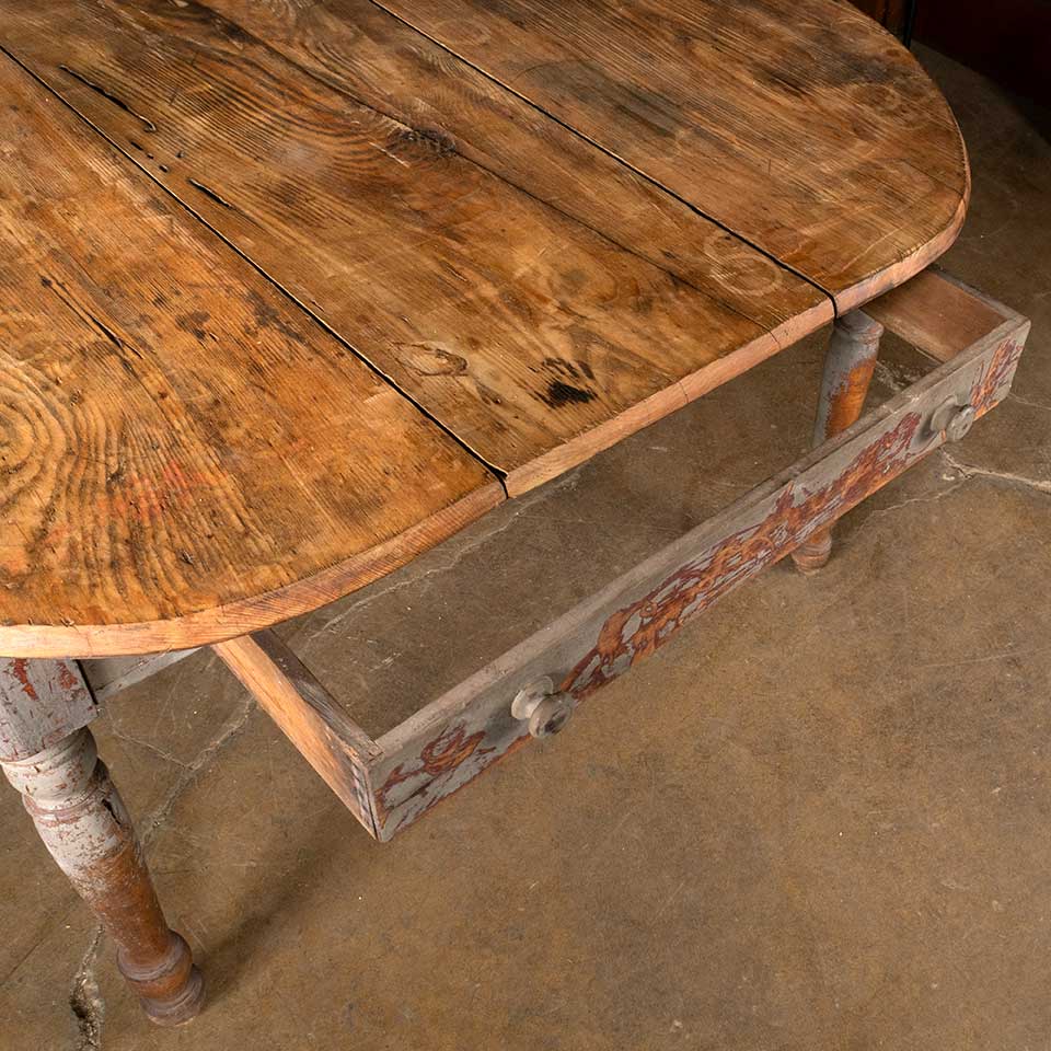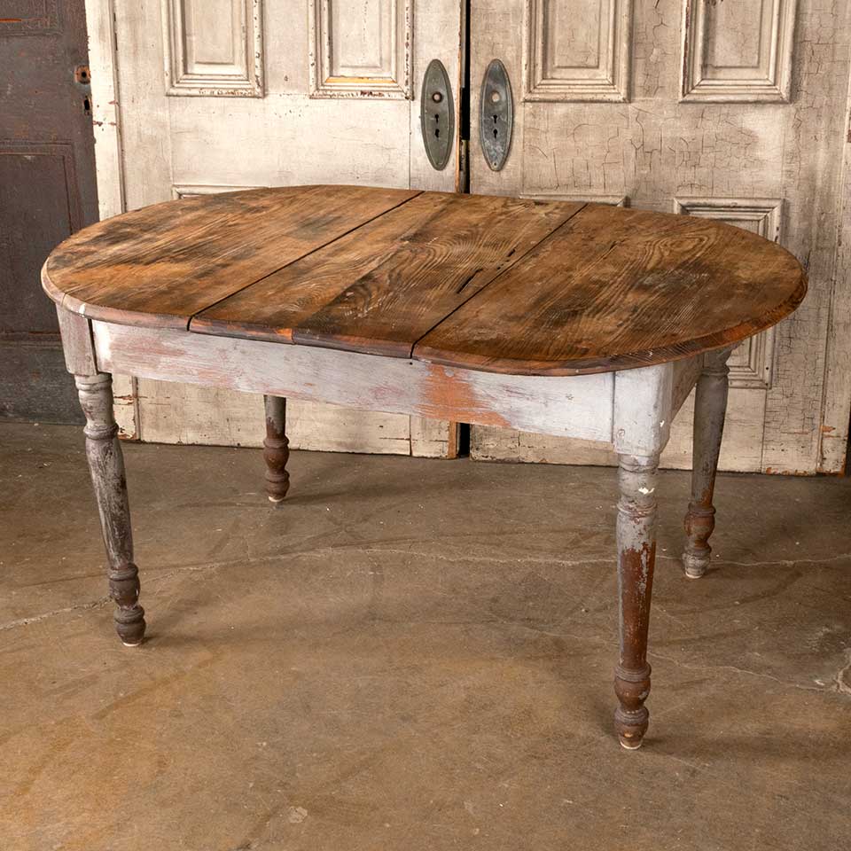 Antique primitive oak table with painted base measuring approx. 53" x 39" x 28 1/2" tall. There's a split in the middle top piece that's reinforced with metal strap brackets and the bottom of the drawer is missing. See photos to evaluate condition.