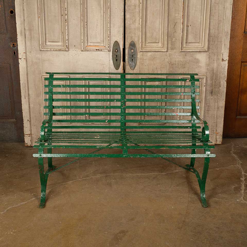 Architectural salvage antique painted metal slat wrought iron garden patio park bench measuring approx. 47 1/2" wide x 30 1/2" tall x 28" front to back. See photos to evaluate condition.