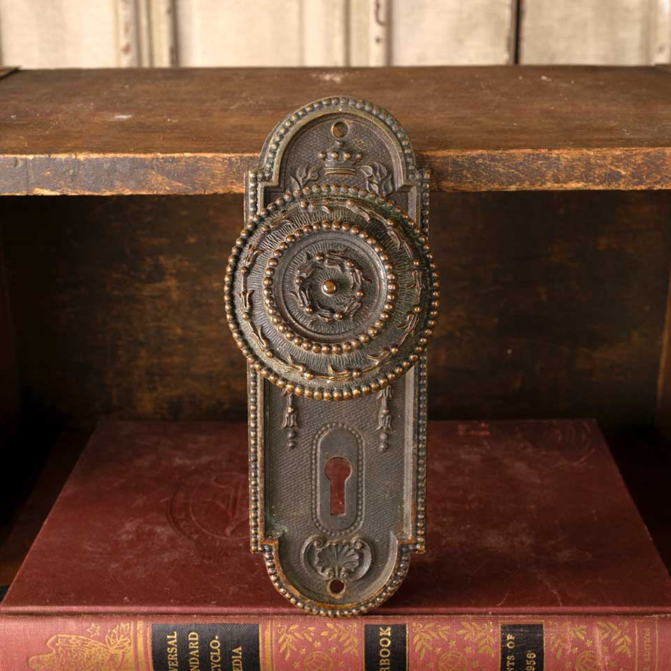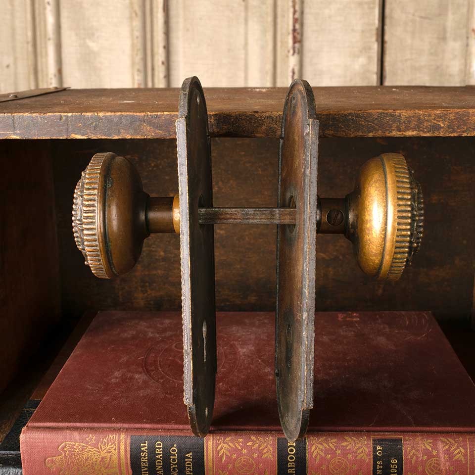 Architectural salvage antique Mallory Wheeler c. 1900 ornate bronze interior door hardware set which includes 2 doorknobs (2 1/8" in diameter), 2 backplates (2 1/8" wide x 6 3/4" tall with spindle and keyholes 2 1/4" on center), and a tapped spindle with set screws. Color and condition vary. Priced at $225/set.