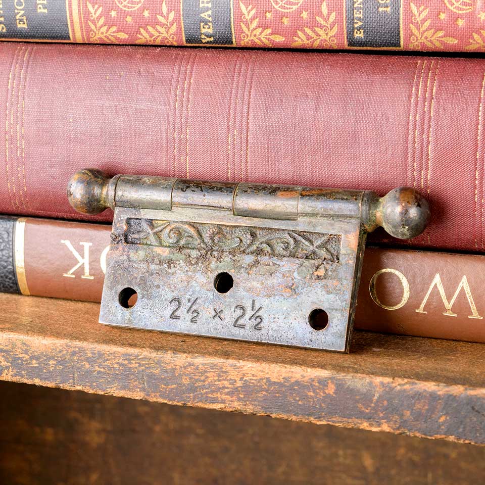 Architectural salvage antique ornate door / furniture butt hinge with ball finials measuring approx. 2 1/2" x 2 1/2" (3 5/8" tall overall including finials). Color and condition may vary.