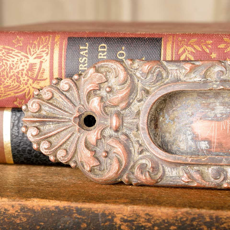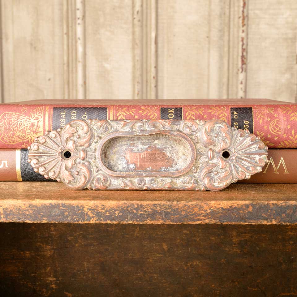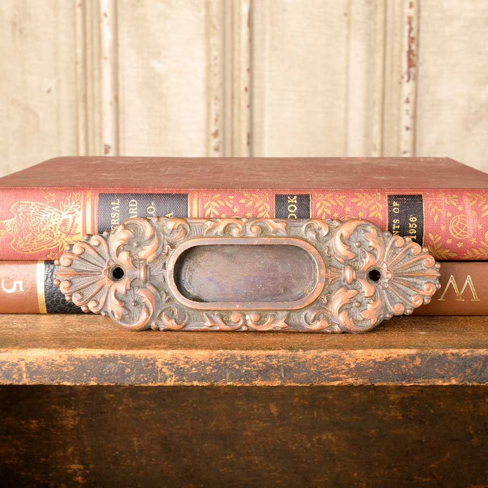 Architectural salvage antique ornate bronze window sash lift hardware measuring approx. 5 1/2" wide x 1 5/8" tall x 1/2" front to back. The recessed area measures approx. 2 1/8" wide x 7/8" tall. Color and condition may vary.