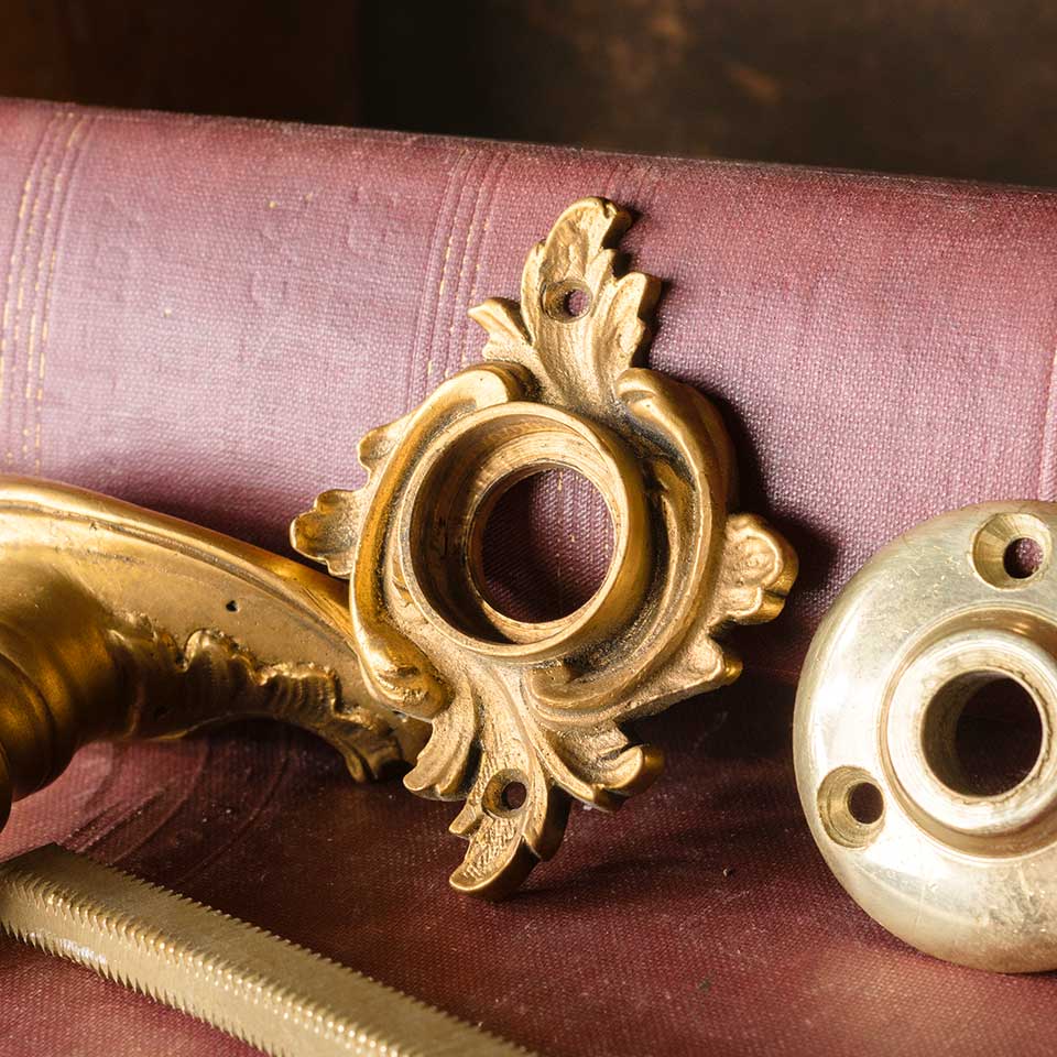 Architectural salvage ornate solid brass Louis XV style single closet doorknob door hardware set. Includes one doorknob (1 1/4" x 3 1/8"), one matching backplate (1 7/8" x 2 1/2"), a round rosette backplate (1 1/2" in diameter), and a threaded closet spindle with two set screws. Color and condition may vary. Priced at $150/set.