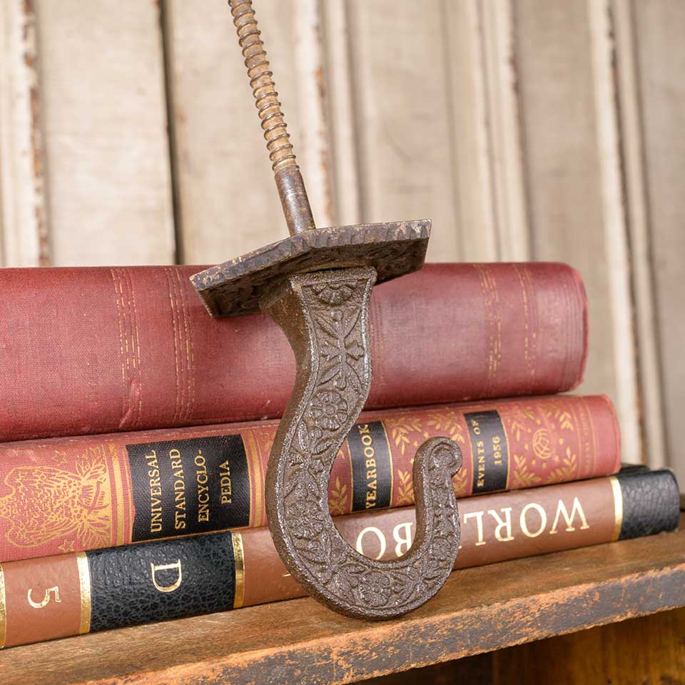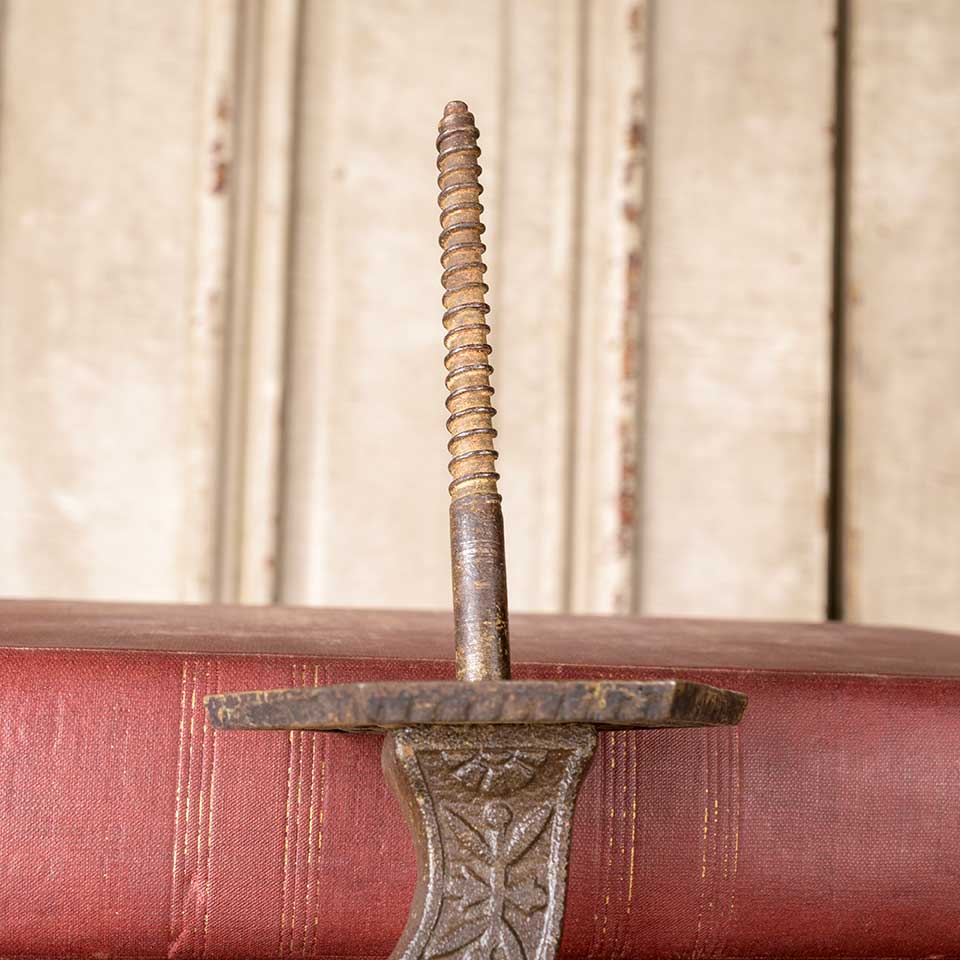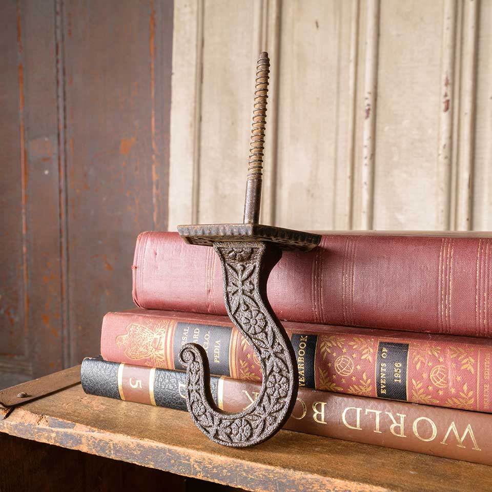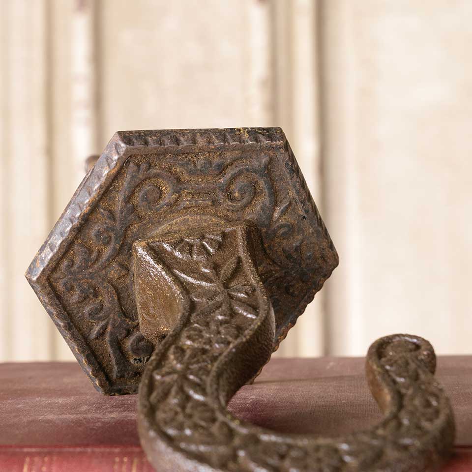 Architectural salvage antique cast iron Victorian Eastlake patterned chandelier ceiling hook with integral wood screw and removable backplate measuring approx. 2 7/8" wide x 7 1/4" tall (hook itself is 3 1/2" tall). See photos to evaluate condition.