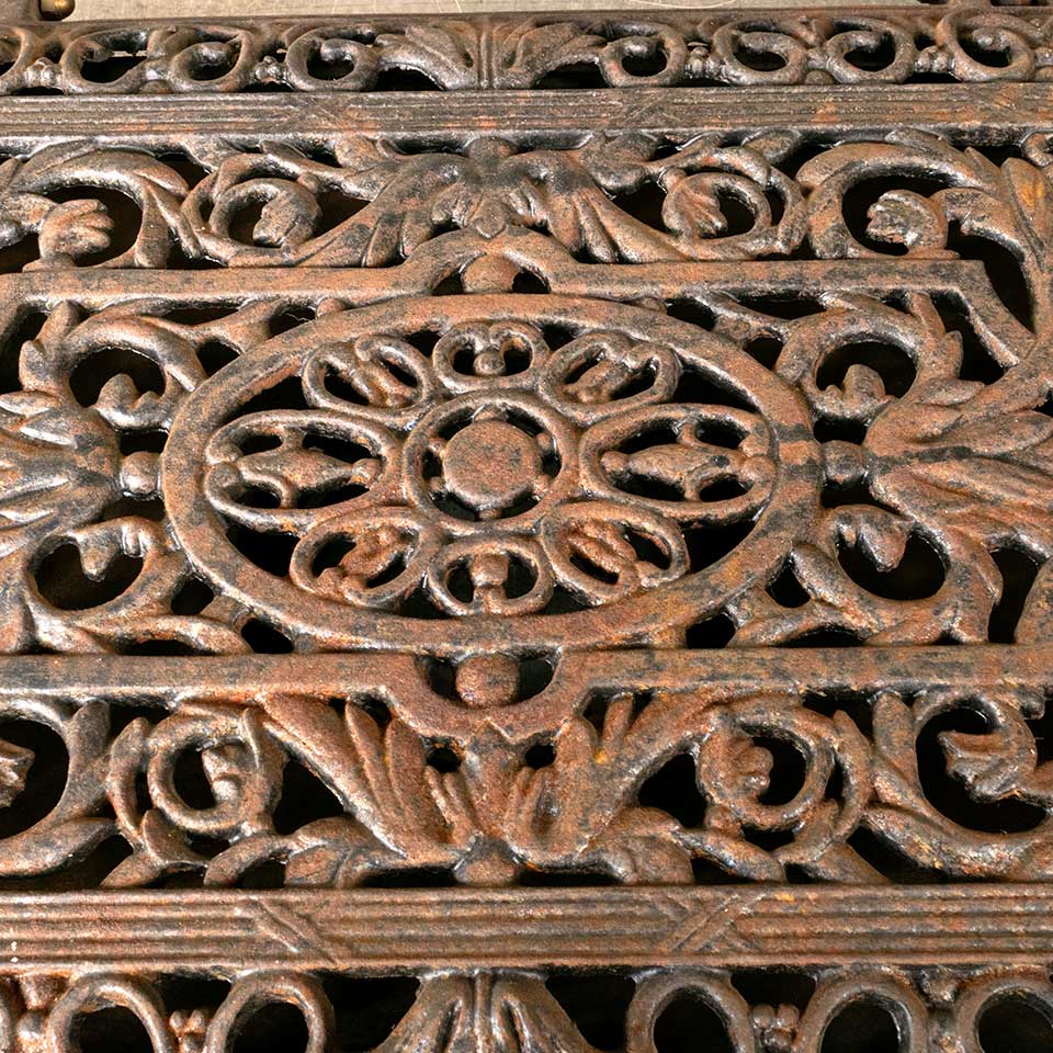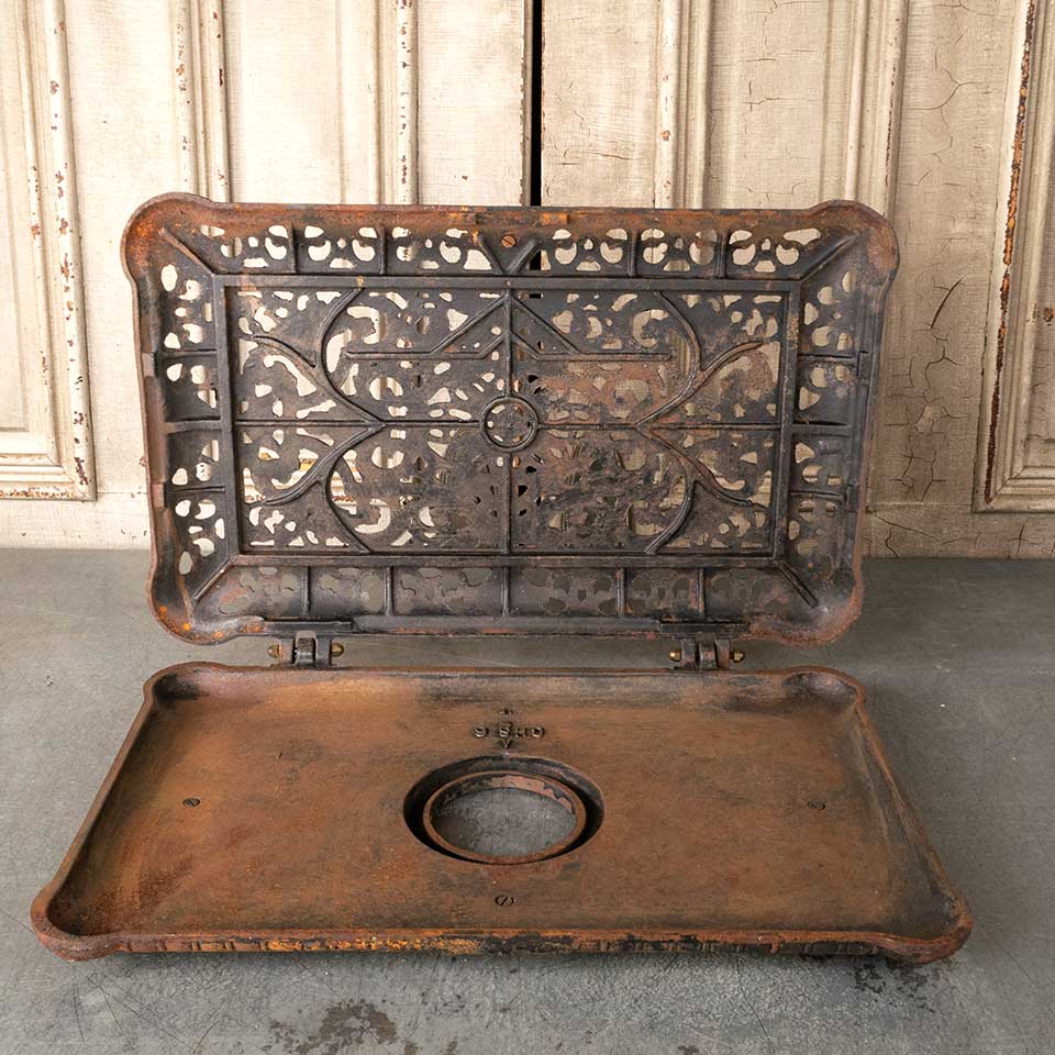Antique architectural salvage ornate cast iron hinged stove top measuring approx. 25" wide x 3" tall x 16" front to back. See photos to evaluate condition.