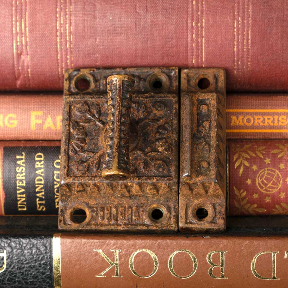Architectural salvage antique ornate Victorian spring loaded cast iron and brass kitchen cabinet pantry door latch and catch hardware. The latch measures approx. 1 5/8" wide x 2 1/4" tall x 1 1/4" front to back and the catch measures approx. 5/8" wide x 2 1/4" tall x 3/4" front to back. Color and condition may vary.